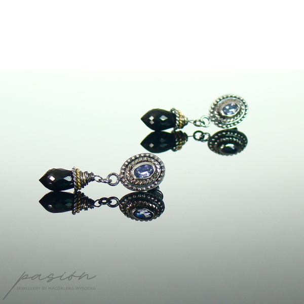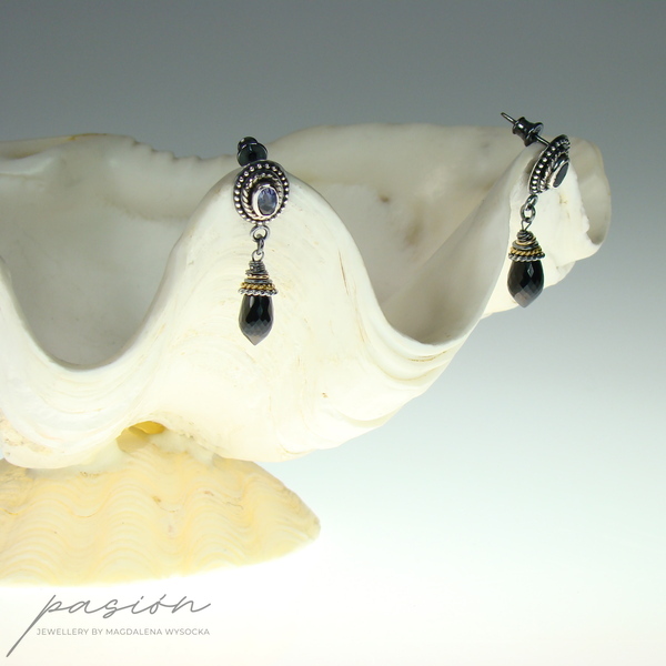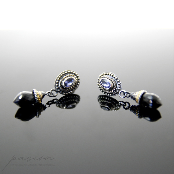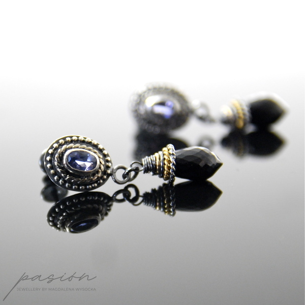 Blask lawendowego Iolitu oprawionego w srebro podkreślają złote kółka (stop 14ct złota typu gold filled) umieszczone na czarnej markizie Spinelu.