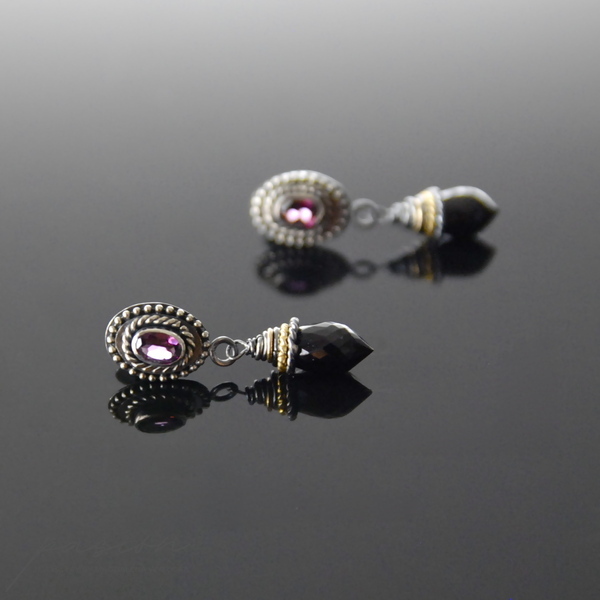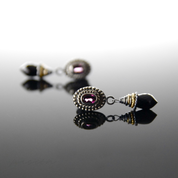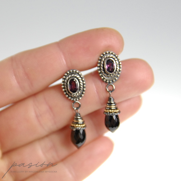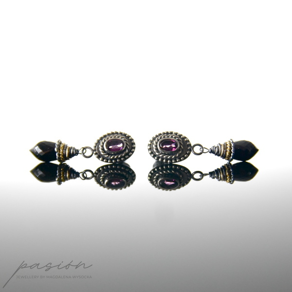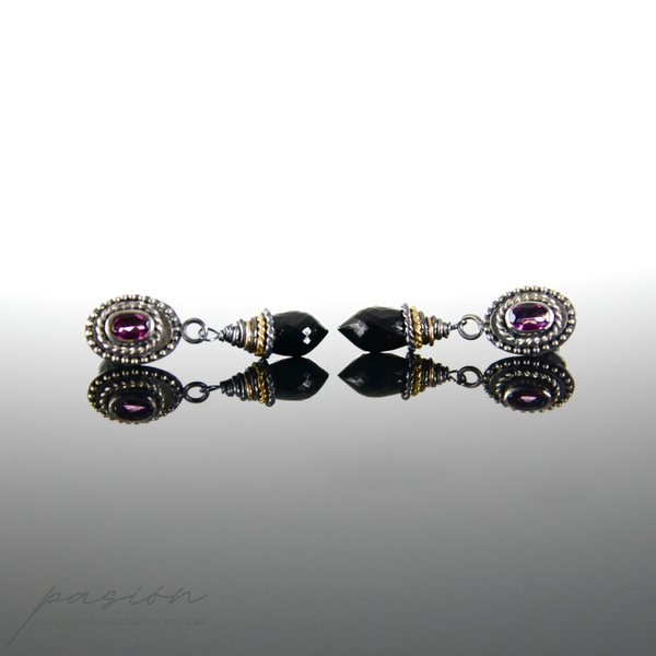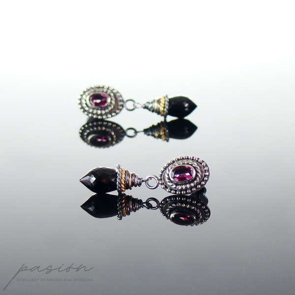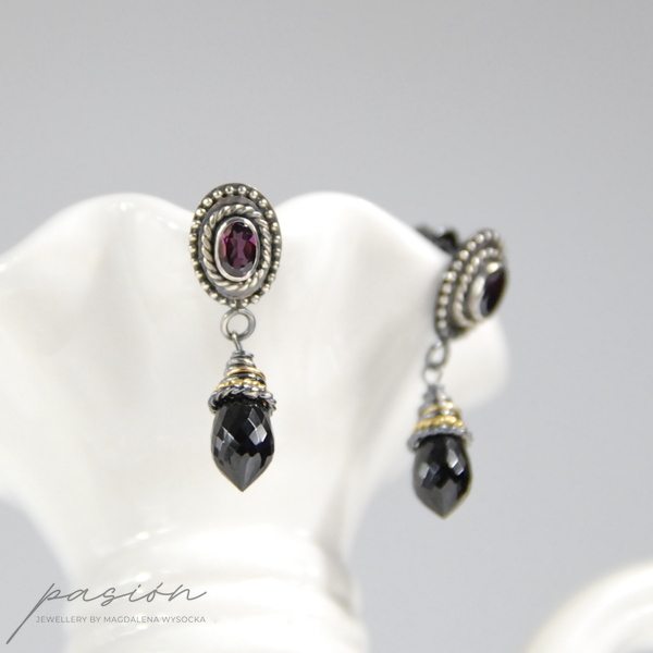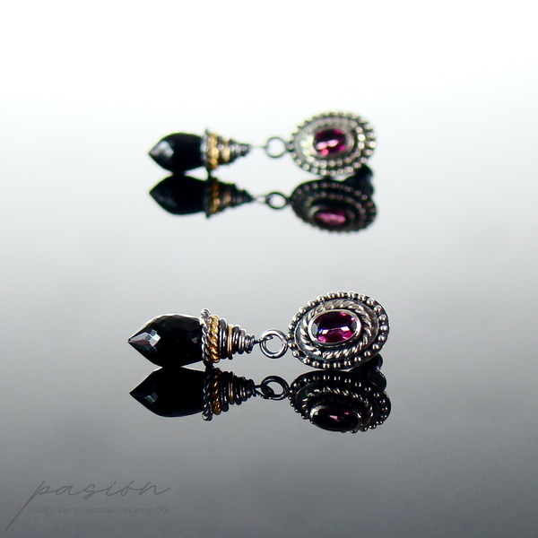 Malinowy Rodolit został oprawiony w srebro i otulony ozdobnym motywem. Blask kamienia podkreślają złote kółka (stop 14ct złota typu gold filled) umieszczone na czarnej markizie Spinelu.