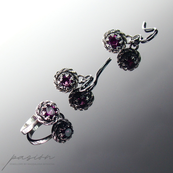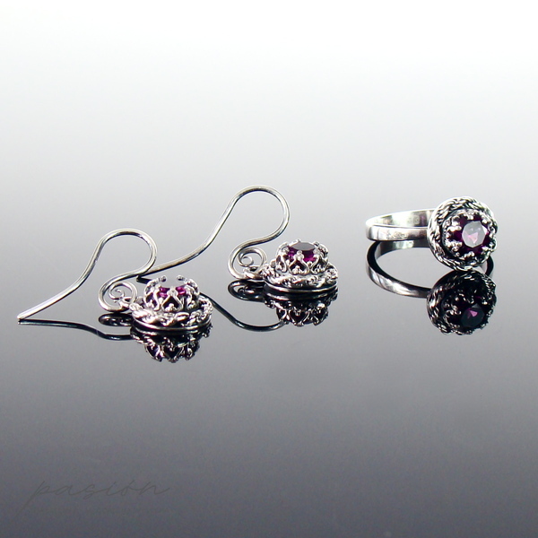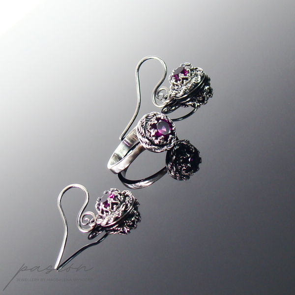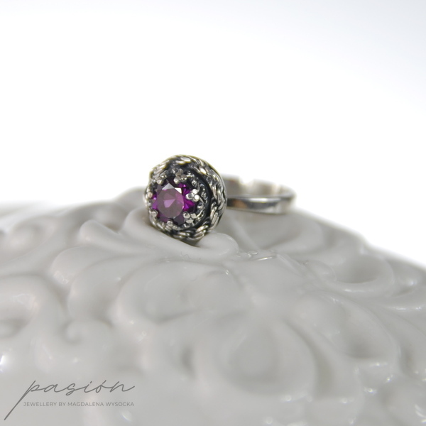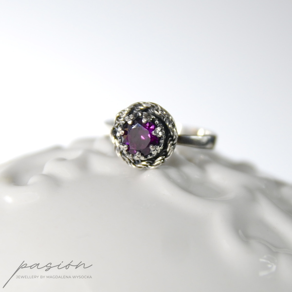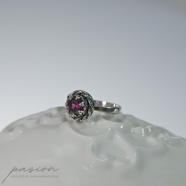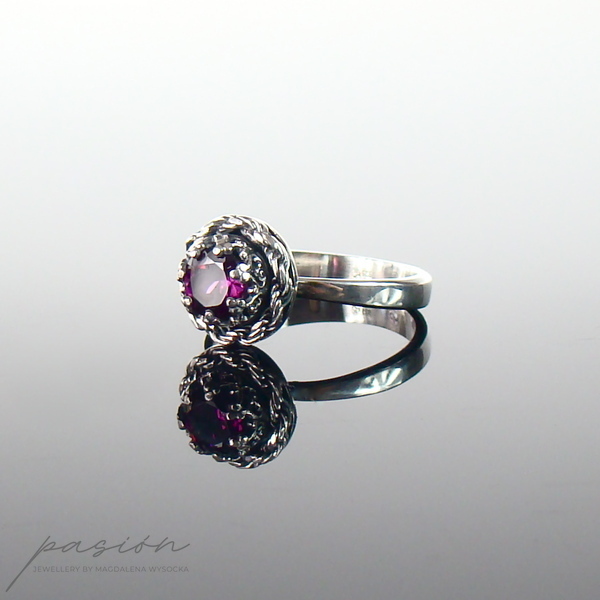 Główną ozdobą pierścionka jest przepiękny malinowy Rodolit (odmiana Granatu) o średnicy 6 mm i szlifie diamentowym otulony srebrną rzeźbą w postaci korony.