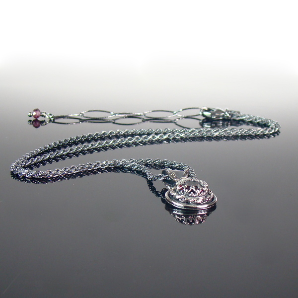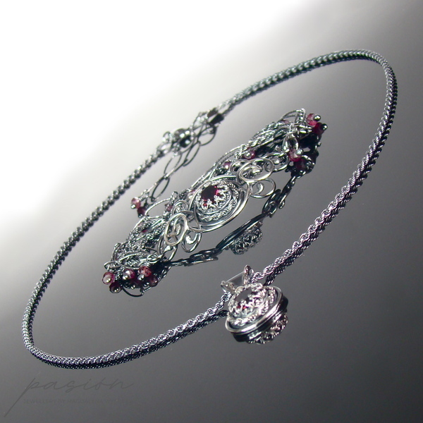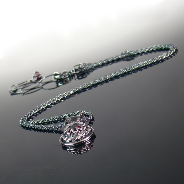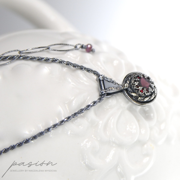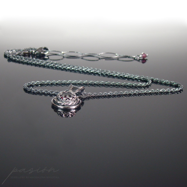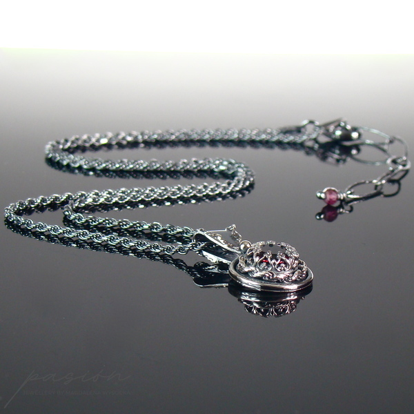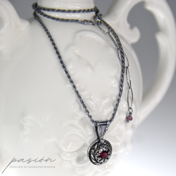 Na zdobionej elegancko, wykonanej ręcznie zawieszce zawisł oprawiony w srebrną koronę drogocenny, najwyższej jakości Rodolit o maliniowym odcieniu. Rodolit ma aż 8 mm średnicy i posiada najwyższą klasę czystości AAA.