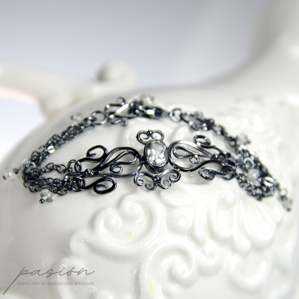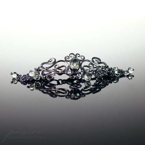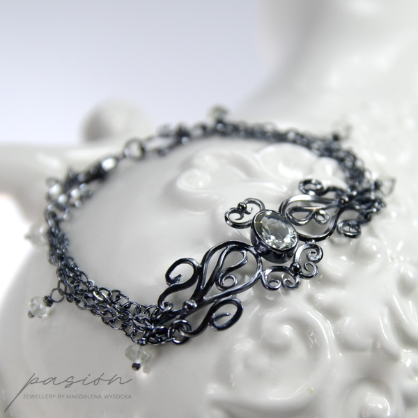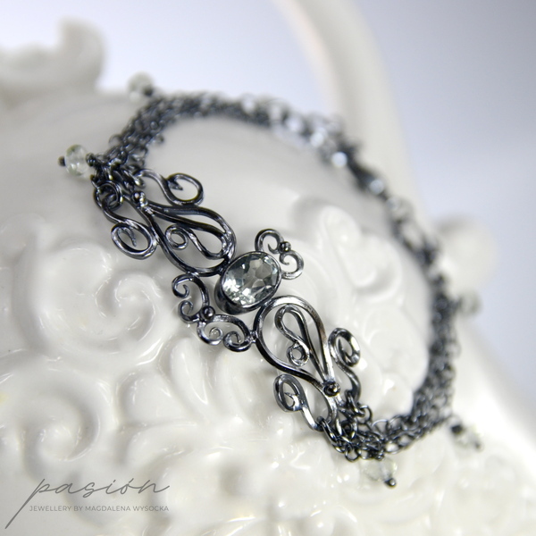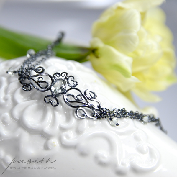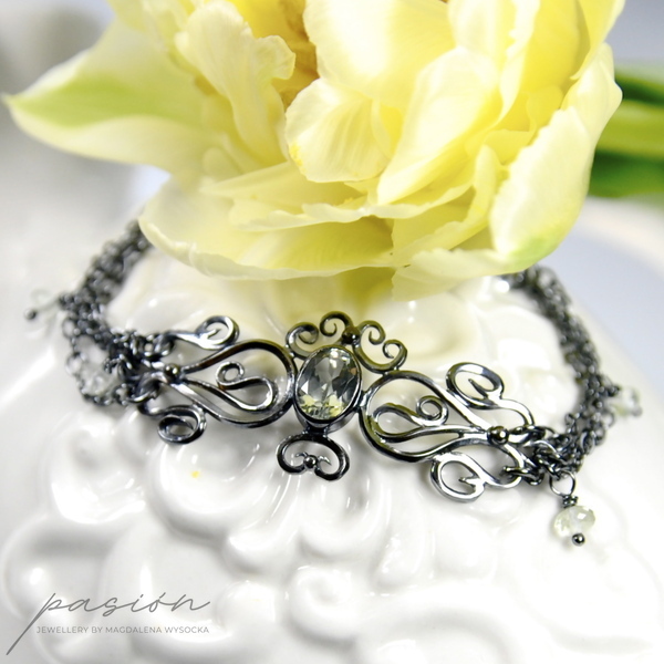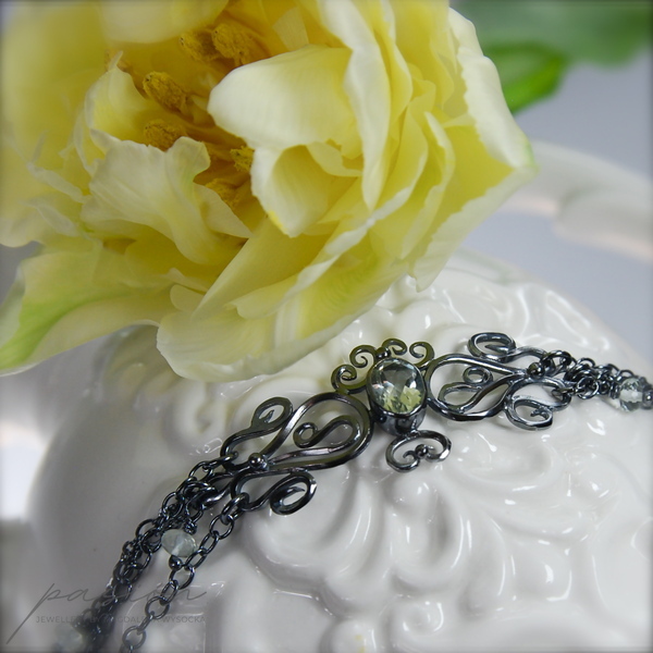 Lekka, subtelna bransoleta wykonana ręcznie z oksydowanego na lśniącą czerń srebra próby 925 i 999. Bransoleta ozdobiona jest pięknym, zielonym Ametystem (Prasolitem) o niezwykłym blasku i tajemniczym odcieniu zieleni. Na łańcuszkach zawisły oponki fasetowanych Prasolitów o krystalicznie jasnym odcieniu zieleni.