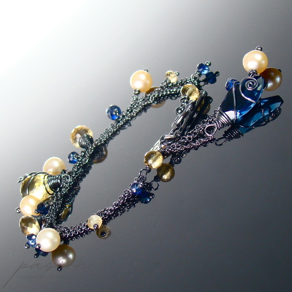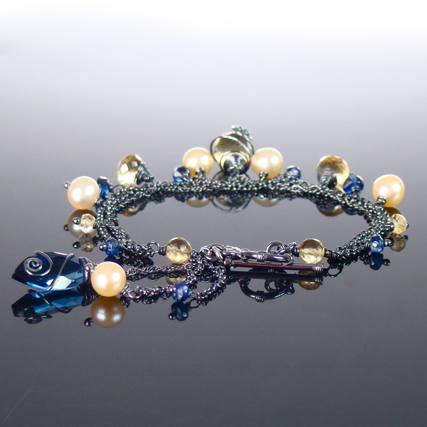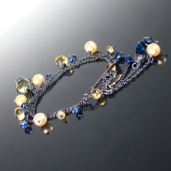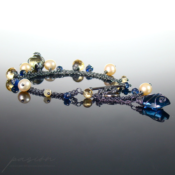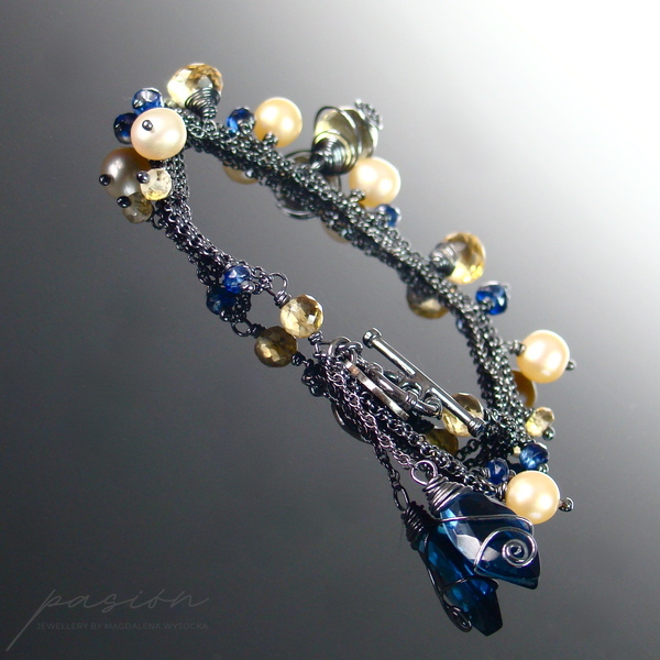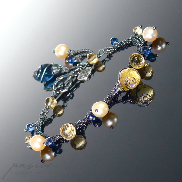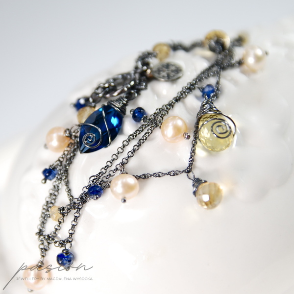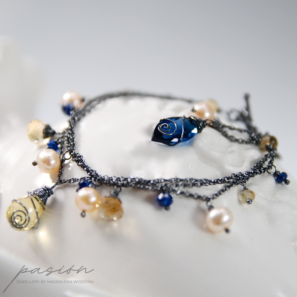 Lekka, srebrna bransoletka z kolekcji THE GOOD FEELING wykonana ręcznie ze srebrnych łańcuszków próby 925 zoksydowanych na lśniącą czerń. Całość ozdobiona jest naturalnymi fasetowanymi Cytrynami o różnym kształcie, granatowymi oponkami Kyanitów, naturalnymi Perłami w odcieniu brzoskwiniowym oraz przepiękną markizą kaszmirowego Kwarcu.