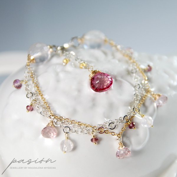 Bransoletka została ozdobiona fasetowanymi kulami Kwarcu Różowego, fasetowanymi brioletkami i oponkami Różowych Topazów i oponkami malinowych Rodolitów. Niektóre złote, ozdobne elementy wykonane zostały ze srebra złoconego 24ct złotem (Vermeil).