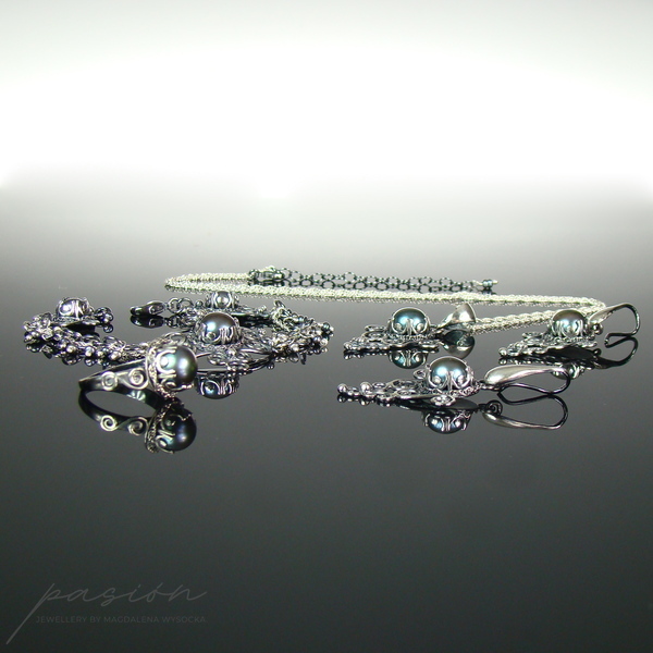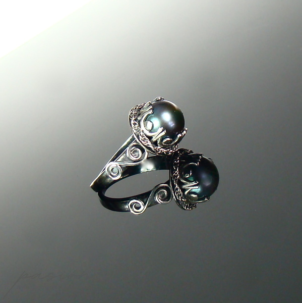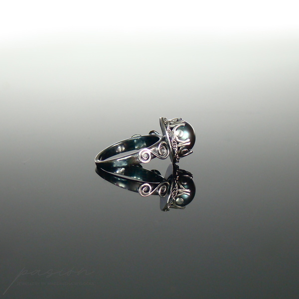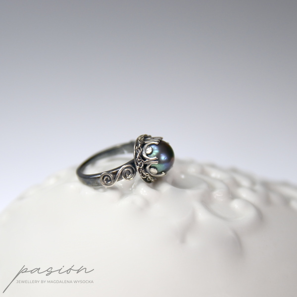 Oryginalny pierścionek wykonany ręcznie ze srebra próby 925 oraz naturalnej "czarnej" perły w odcieniu peacock, która zmienia odcień w zależności od światła i otoczenia od turkusowego poprzez fiolet do niebieskiego.