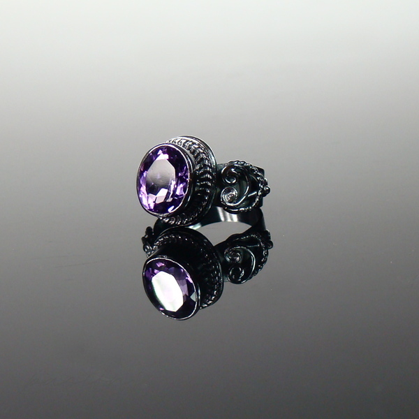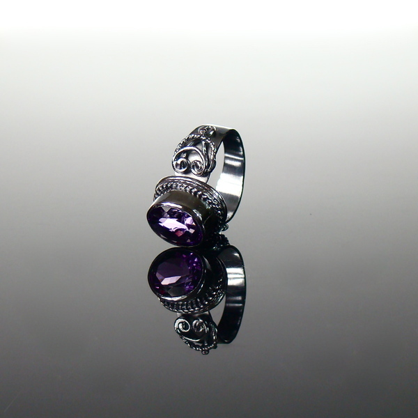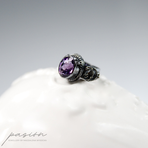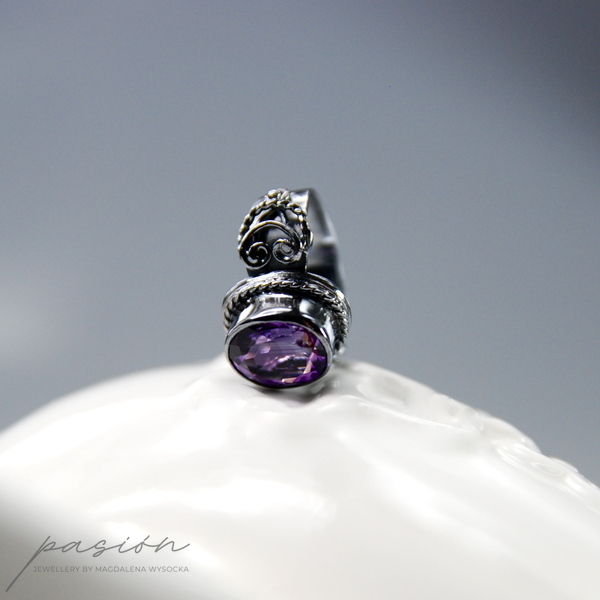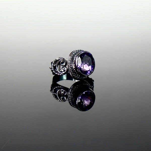 Wytworny pierścień z purpurowym Ametystem wykonany ręcznie ze srebra próby 925.