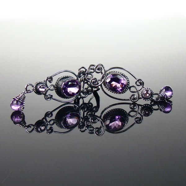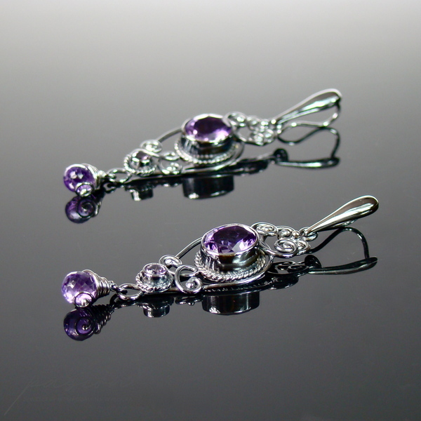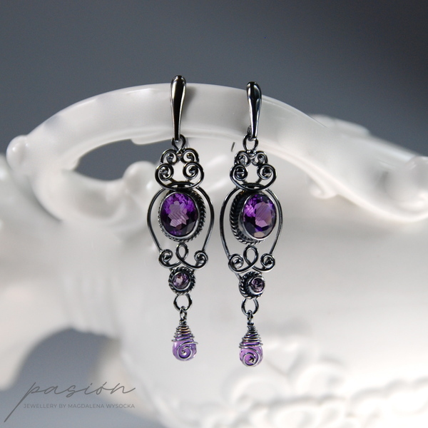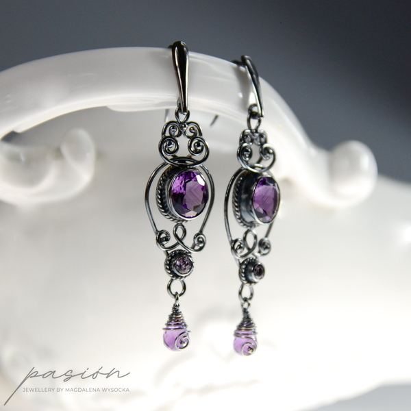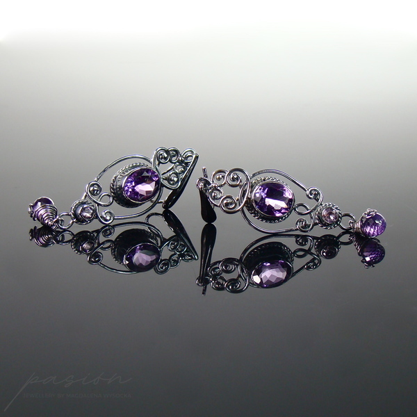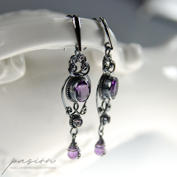 Na eleganckich biglach zawisły oprawione w srebro Ametysty o szlifie diamentowym oraz fasetowane brioletki Ametystow w tym samym kolorze. Całość pracy został zoksydowana na lśniącą czerń oraz wypolerowana.