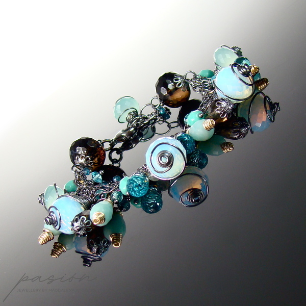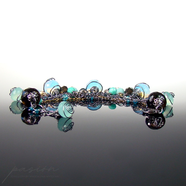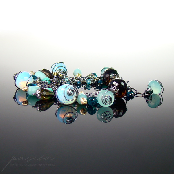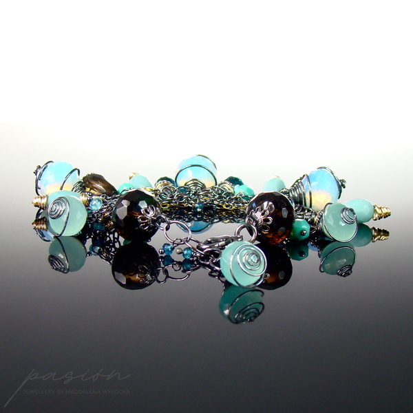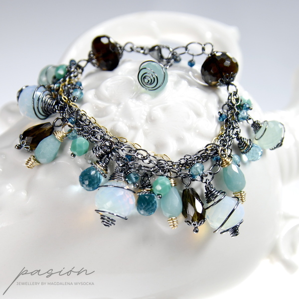 Na wielu łańcuszkach o różnej strukturze oczek (cztery wykonane ze Srebra próby 925, jeden - ze stopu 14ct Złota typu Gold Filled) zawisły fasetowane kamienie: okazałe owale i brioletki Kwarcy Dymnych, cebulki Opalitu z olśniewającą błękitno-złotą opalizacją, cebulki Chalcedonów aqua, brioletki Akwamarynów i Niebieskich Kwarcy Swiss Blue, oponki Apatytu i Topazów mistycznych London Blue oraz beczułki Turkusu.