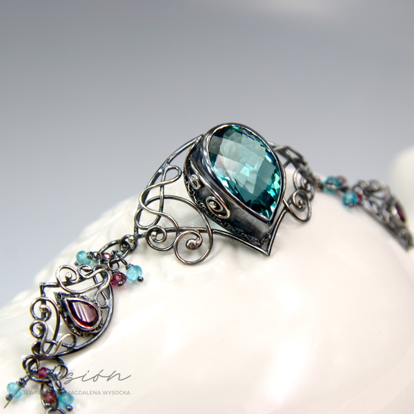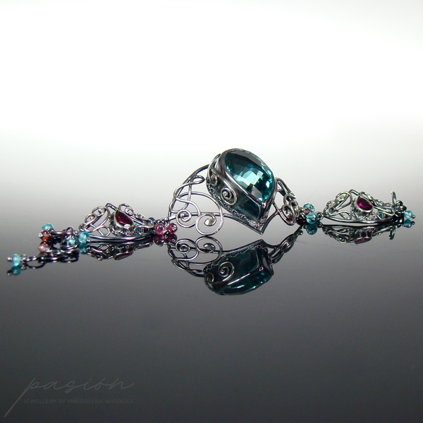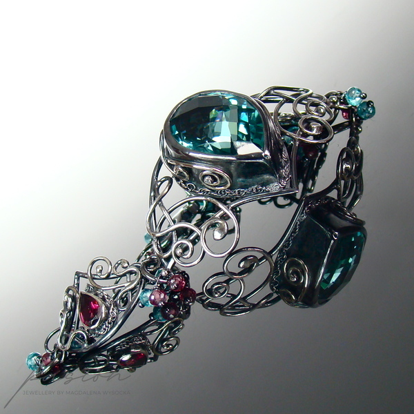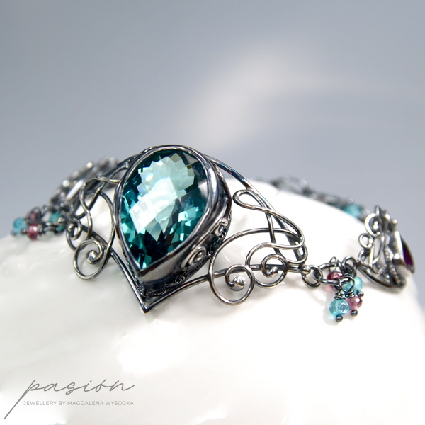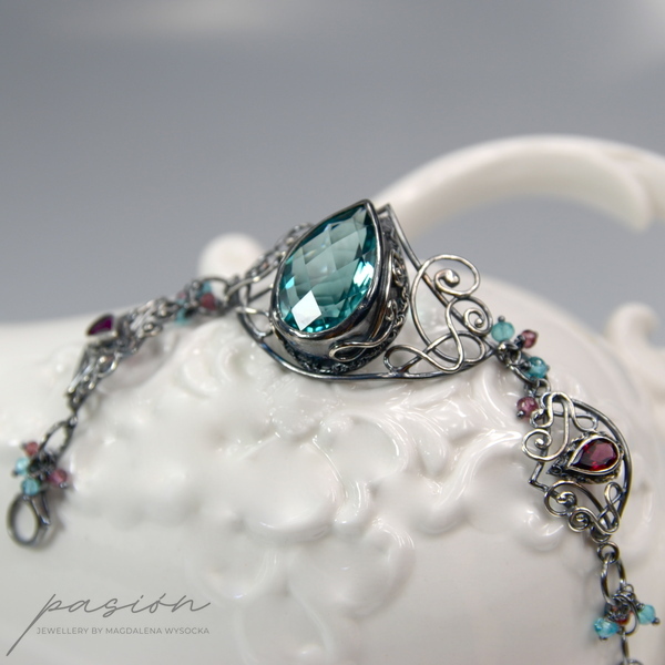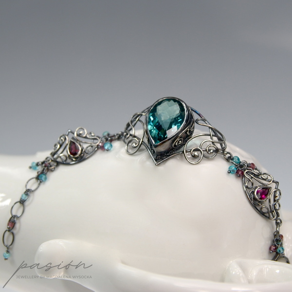 Bransoleta wykonana jest z trzech elementów połączonych w sposób umożliwiajacy idealne dopasowanie bransolety. Sercem bransolety jest niezwykły turkusowy Kwarc o przepieknym szlifie i kształcie wielkiej kropli. Oprawione w srebro malinowe kamienie to Rodolity w kształcie kropli o szlifie diamentowym. Pomiędzy trzema elementami oraz na łańcuszku przedłużającym zawisły mikrofasetowane oponki Apatytów i Rodolitów.