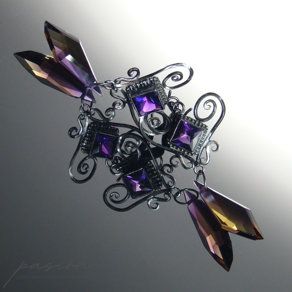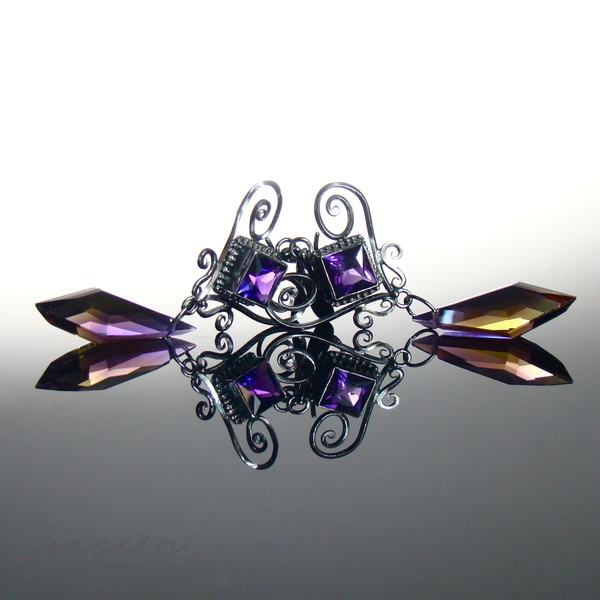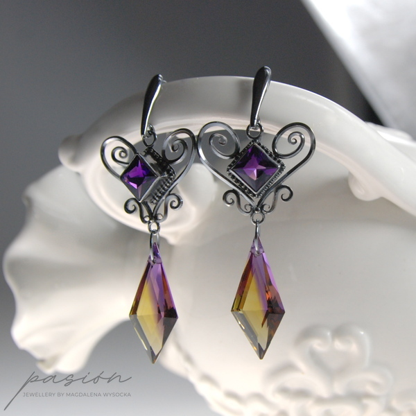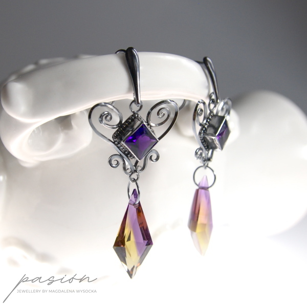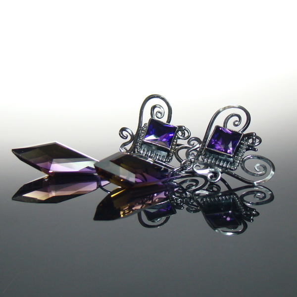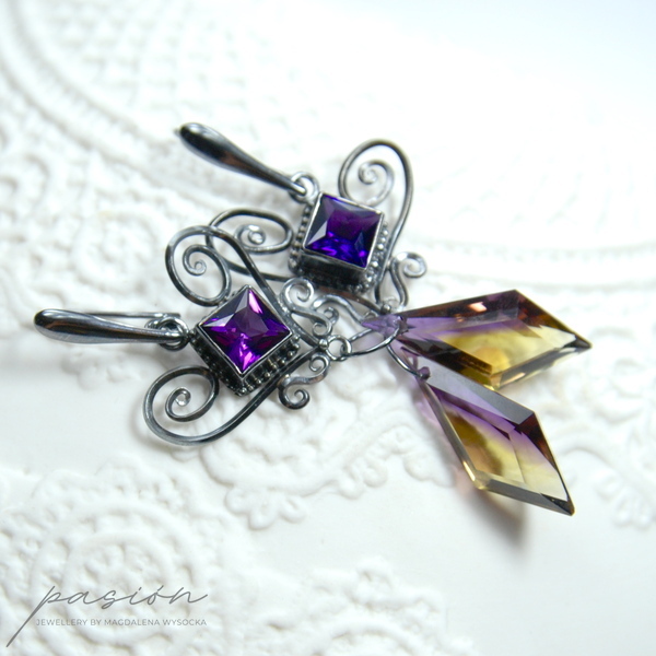 Oryginalne w formie, nieco tajemnicze kolczyki na eleganckich biglach ozdobione najwyższej jakości kwadratowymi Ametystami oraz dwukolorowymi Ametrynami o niezwykle rzadkim i nietypowym kształcie. Ametryn to kamień szlachetny łączący Cytryn i Ametyst, stąd mieni się odcieniami fioletu, ciemnego złota i żółtego.