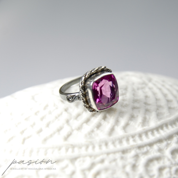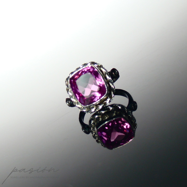 Bardzo kobiecy, elegancki pierścionek ozdobiony najwyższej jakości różowym Topazem w oryginalnym kształcie "cushion".
