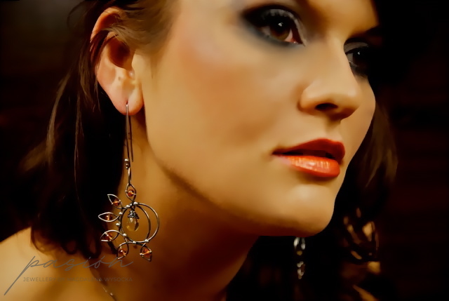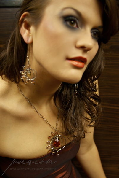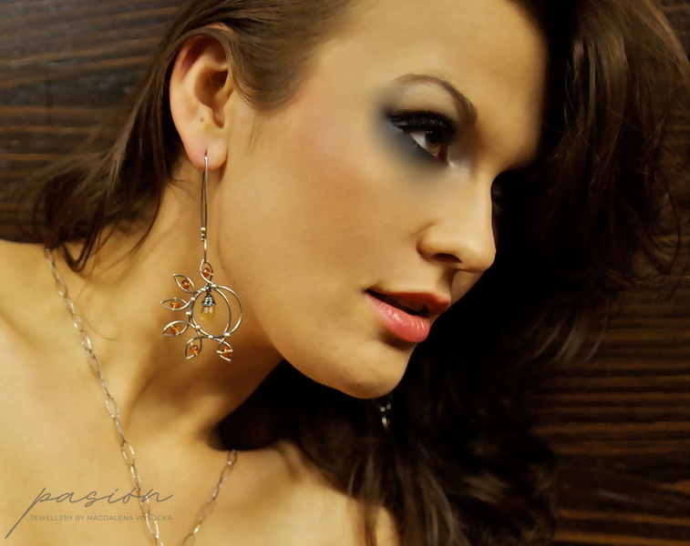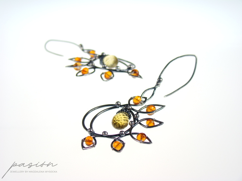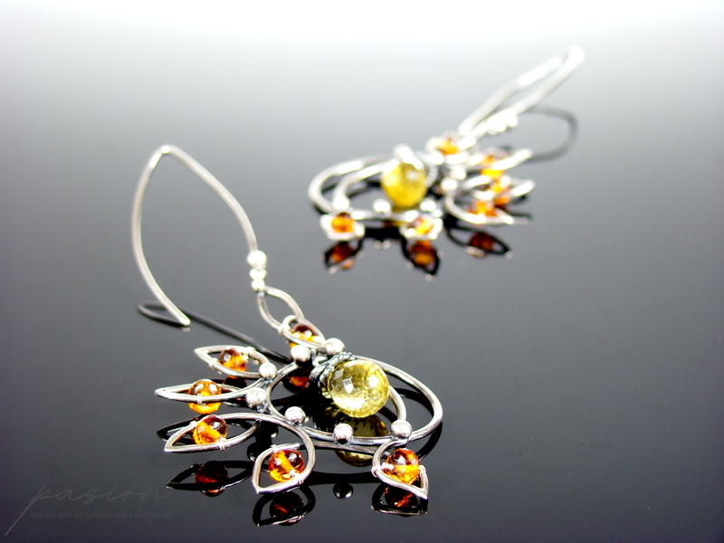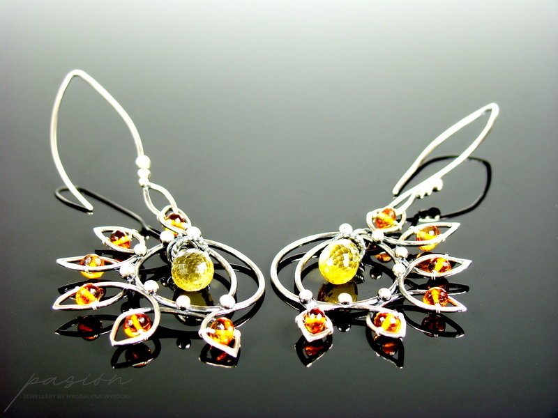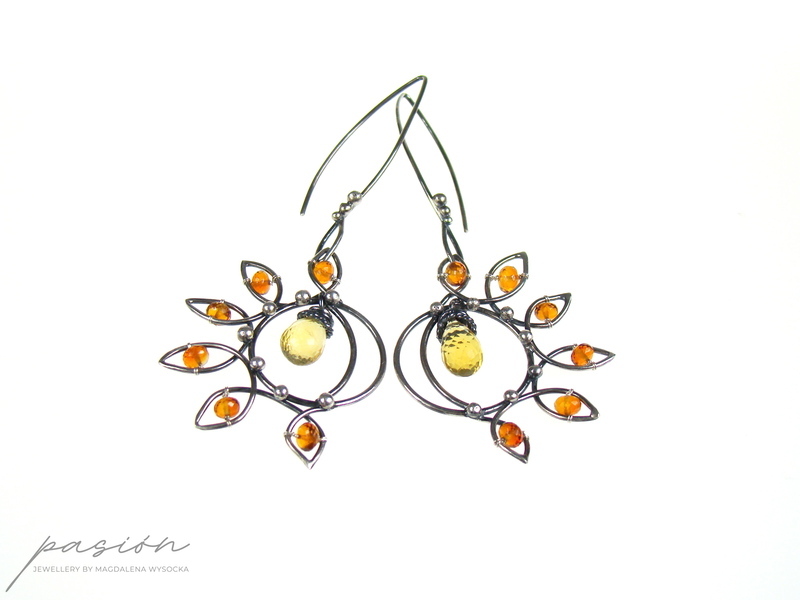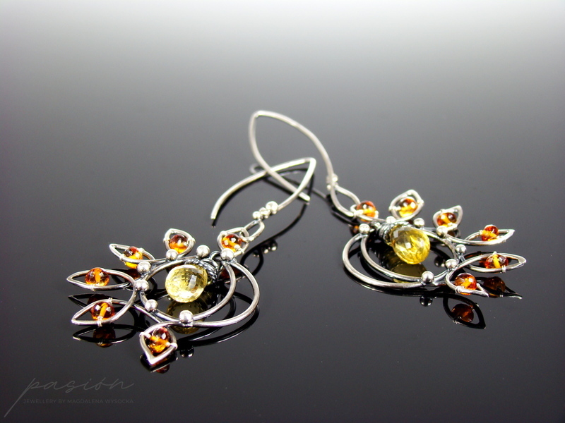 Oryginalne kolczyki inspirowane zjawiskiem zaćmienia słońca, kiedy to wizualnie Słońce spotyka się z Księżycem, wykonane ze Srebra próby 930 oraz 999. Sercem kolczyków są żółte brioletki fasetowanego Fluorytu. W promieniach słońca umieszczone zostały fasetowane kamienie Cytrynów Madeira. Ogniste zawieszki kolczyków zawisły na ręcznie wykonanych efektownych biglach.