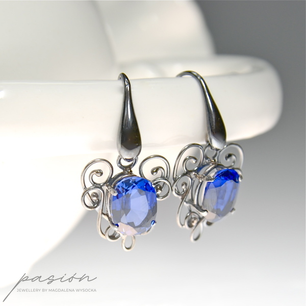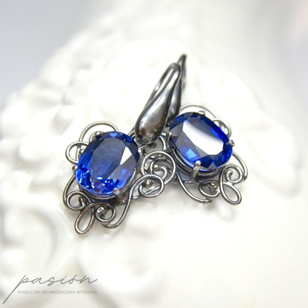 Subtelne, ale bardzo eleganckie kolczyki z naturalnymi, drogocennymi SZAFIRAMI o szlifie diamentowym i owalnym kształcie, wykonane ręcznie ze srebra pierwszej próby 925 i 999.