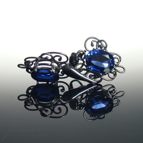 Otoczone srebrnym wzorem Szafiry oprawione zostały w cztery "łapki" i zawieszone na efektownych biglach.