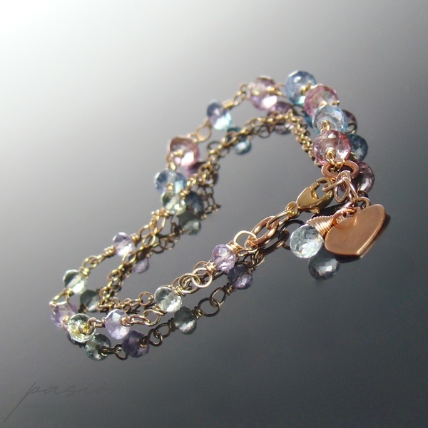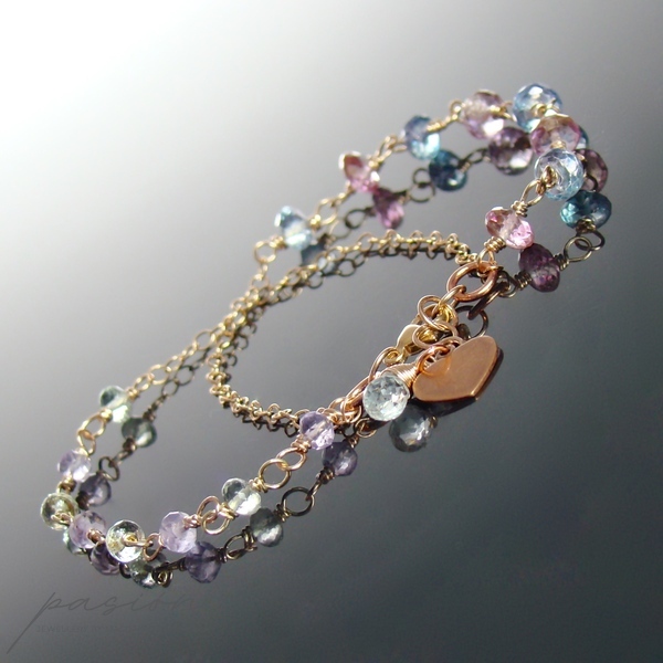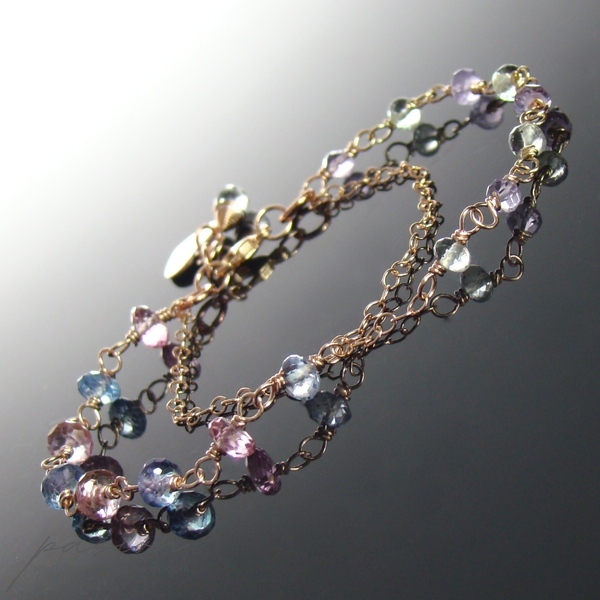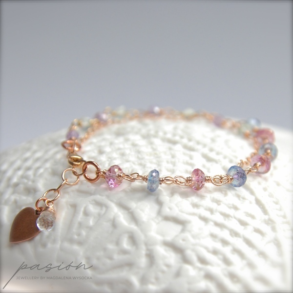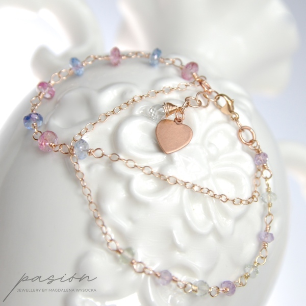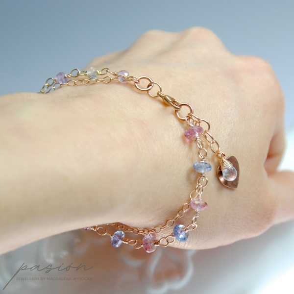 Bransoletka została wykonana ręcznie z dwóch rzędów łańcuszków wykonanych z 14ct stopu Złota typu Rose Gold Filled oraz kółeczek miedzianych. Ozdobiona jest wieloma mikrofasetowanymi kamieniami: różowymi i niebiskimi Topazami w pierwszym rzędzie oraz Prasolitem i lawendowym Ametystem w drugim rzędzie.