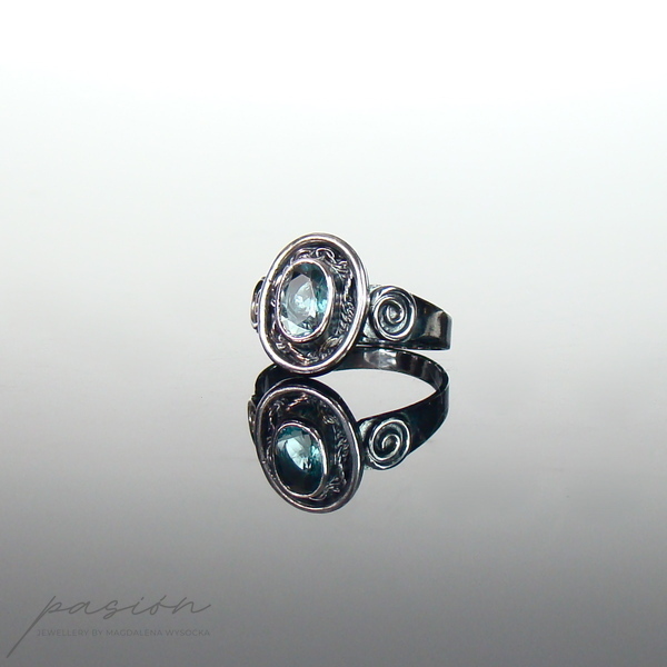 Pierścionek został zoksydowany na lśniącą czerń oraz wypolerowany na jasno wokół kamienia.