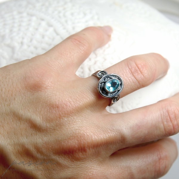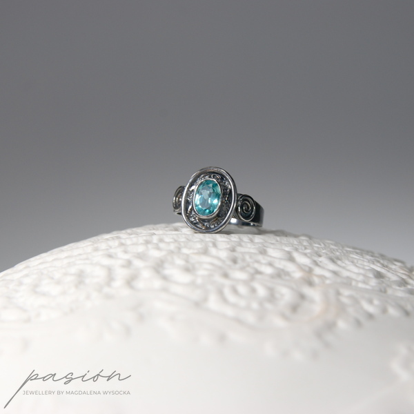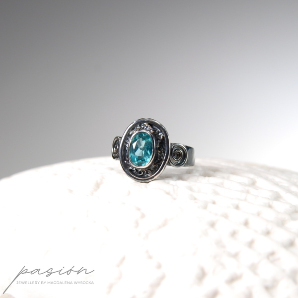 Elegancki w formie pierścionek z turkusowym Apatytem wykonany ręcznie ze srebra próby pierwszej 925 i 999.