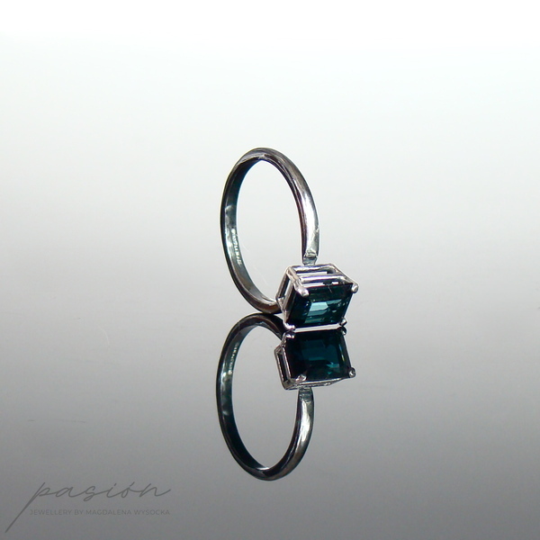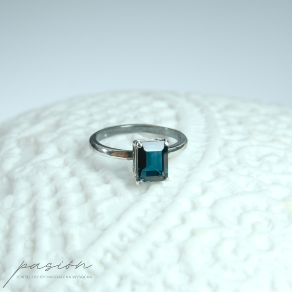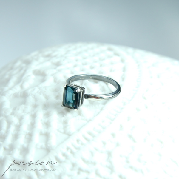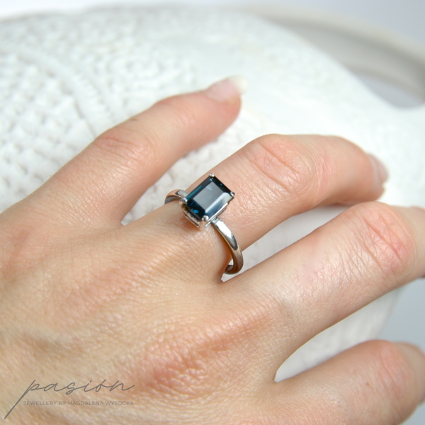 Minimalistyczny, prosty i bez zbędnych ozdób pierścionek wykonany od podstaw ręcznie ze srebra pierwszej próby 925. Główna ozdobą pierścionka jest niespotykany Topaz London Blue o rzadkim kolorze ciemnego turkustu i przepięknym szlifie "emerald".