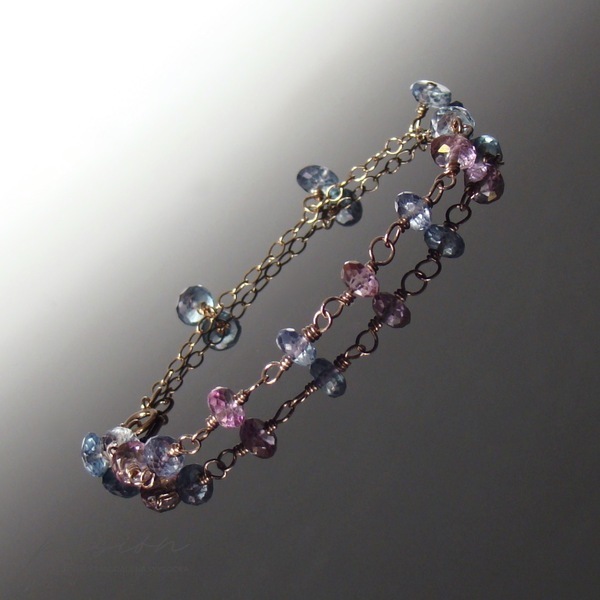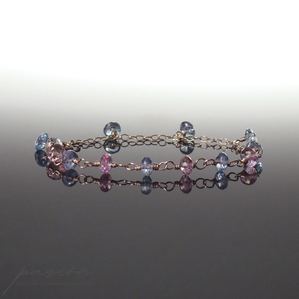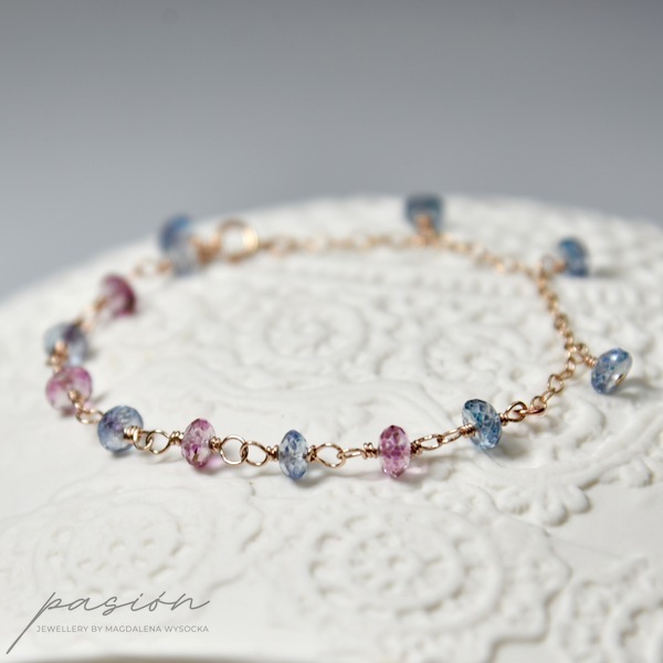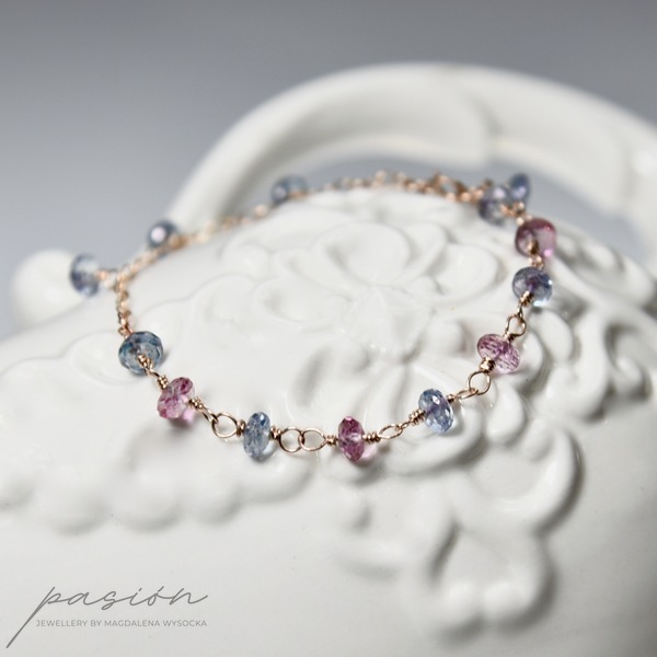 Bransoletka została wykonana ręcznie z 14ct stopu Złota typu Rose Gold Filled oraz ozdobiona mikrofasetowanymi kamieniami: różowymi i niebieskimi Topazami.