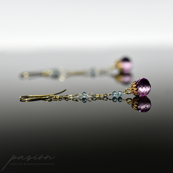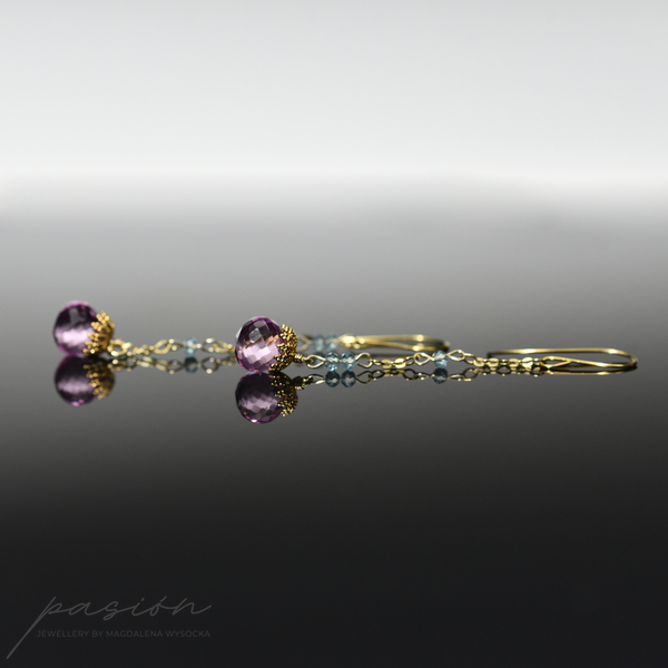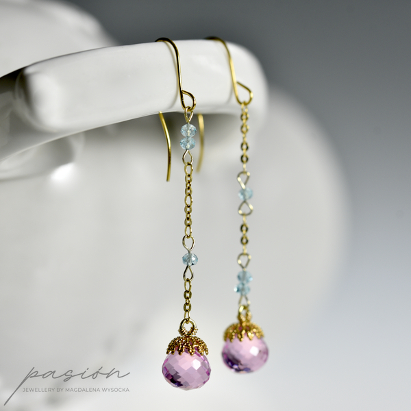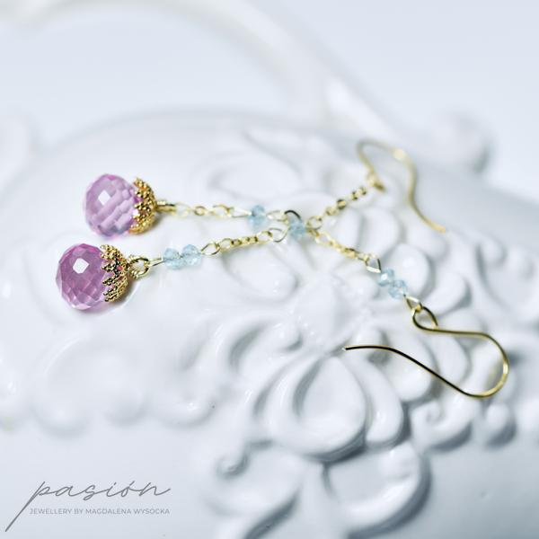 Kolczyki zostały ozdobione mikrofasetowanymi brioletkami różowego Topazu w złoconej koronie oraz mikrofasetowanymi oponkami Apatytów.