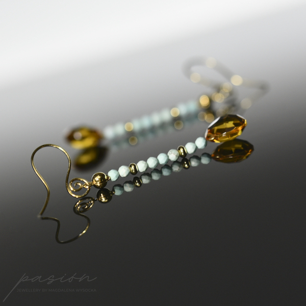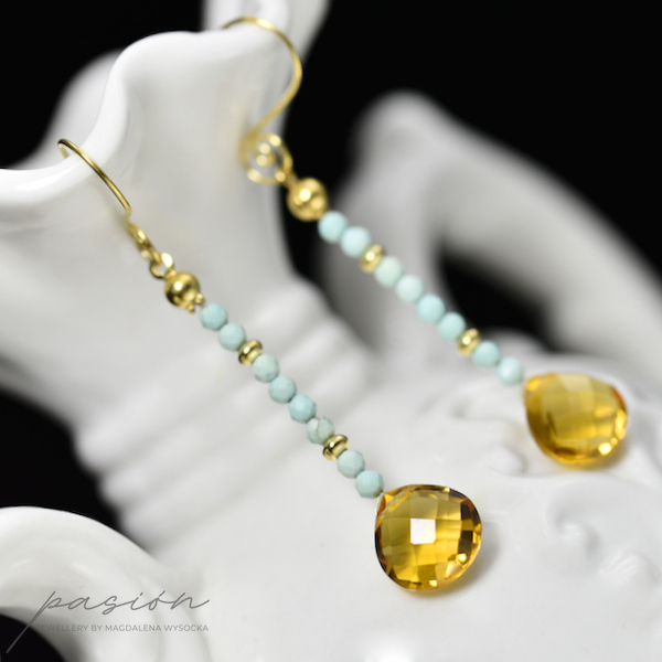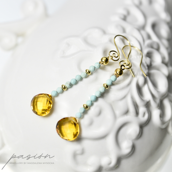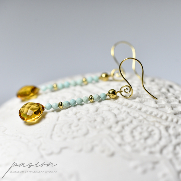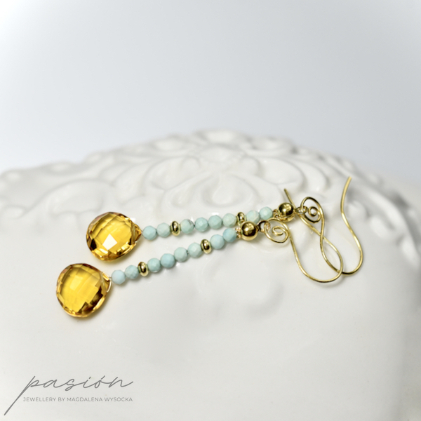 Wakacyjne kolczyki wykonane ręcznie, ozdobione Opalami peruwiańskimi i Cytrynami, zawieszone na standardowych, ozdobionych spiralką biglach. Elementy złote wykonane ze złoconego, 24ct złotem, srebra pierwszej próby 925.