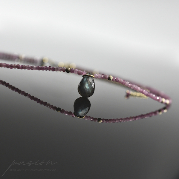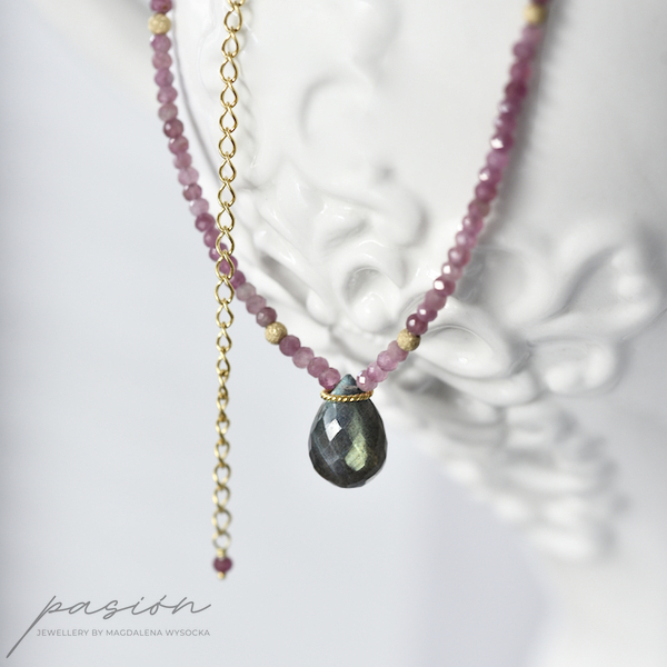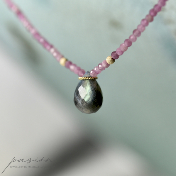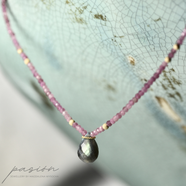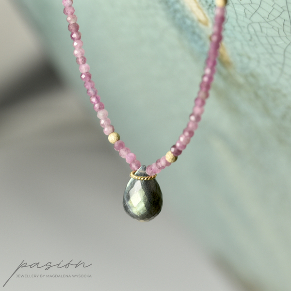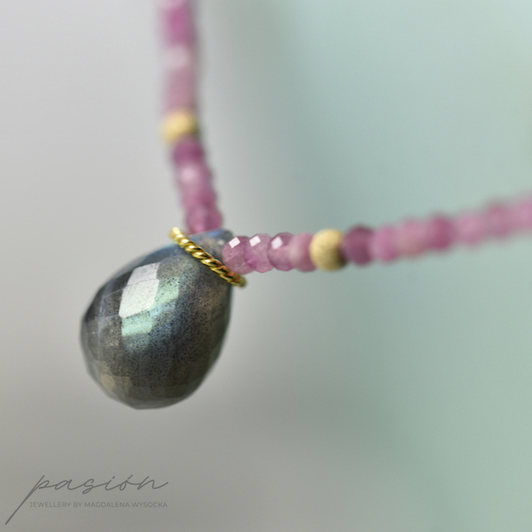 Naszyjnik został wykonany ręcznie z mikrofasetowanych oponek jasnoróżowych Turmalinów w wielu odcieniach oraz fasetowanej, unikalnej briolety Labradorytu, połyskującej turkusem, błękitem i zielenią, w zależnosci od światła.
