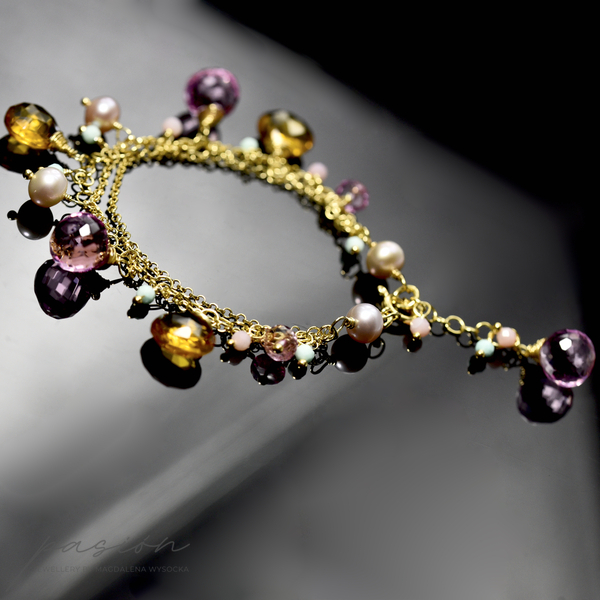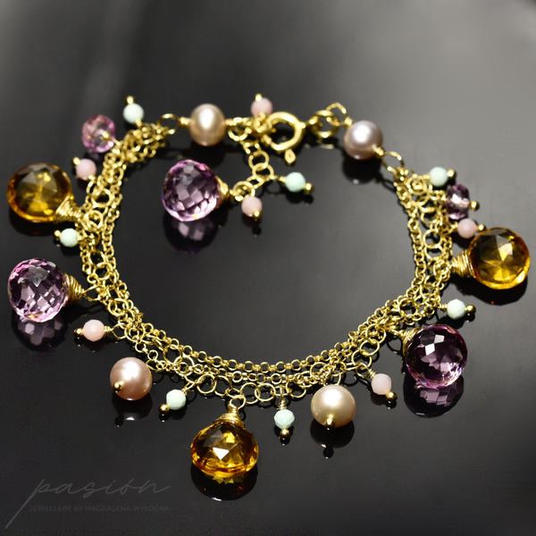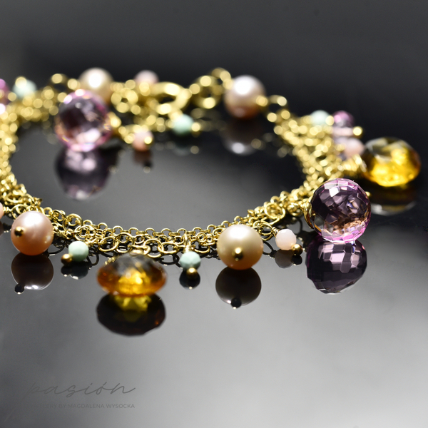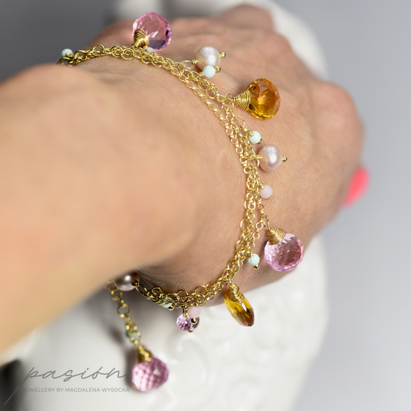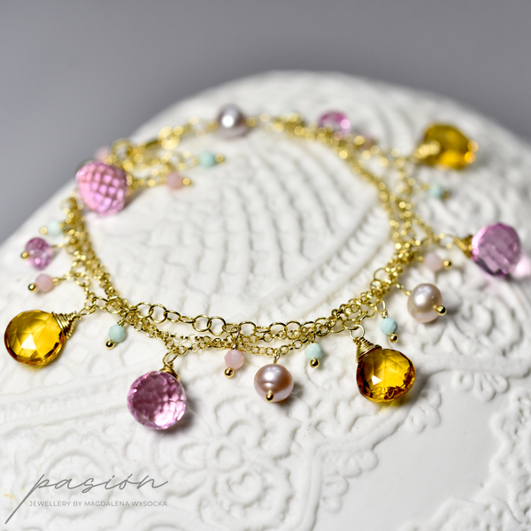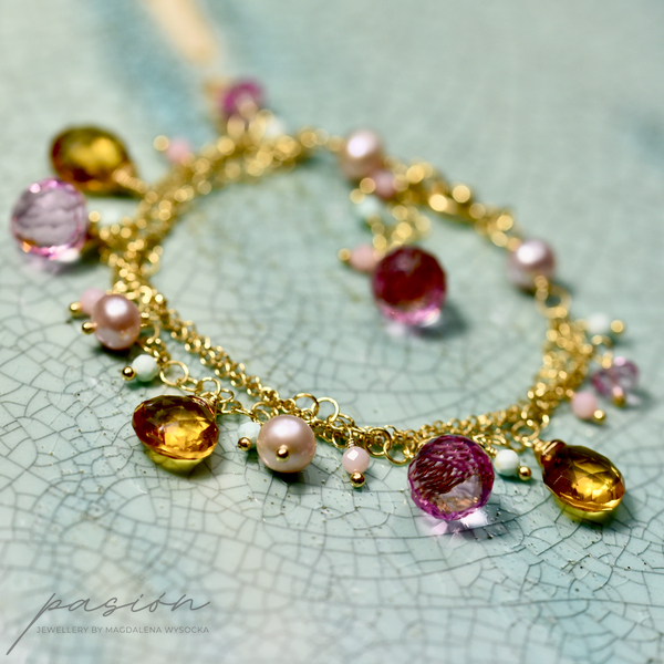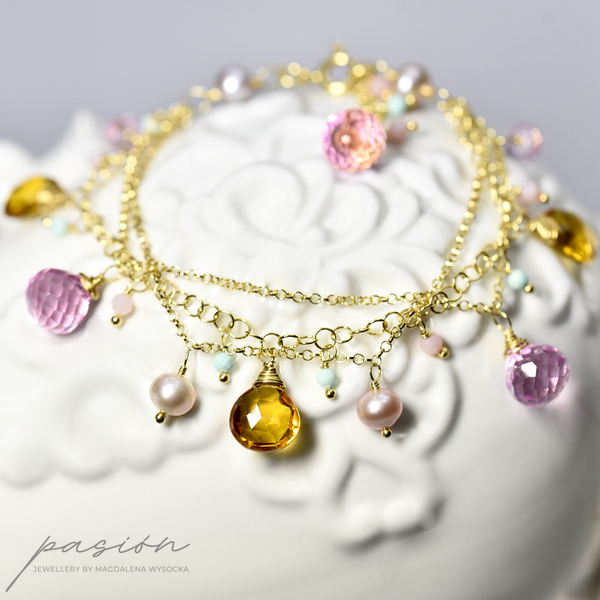 Na trzech złoconych łańcuszkch zawisły kamienie w intensywnych odcieniach: przepiękne fasetowane ciemne Cytryny madeira w złoto-pomarańczowym odcieniu whisky, różowe i miętowe Opale peruwiańskie w niesamowitym pastelowym odcieniu, różowo-łososiowe naturalne Perły hodowlane oraz różowe Topazy o niespotykanym blasku.