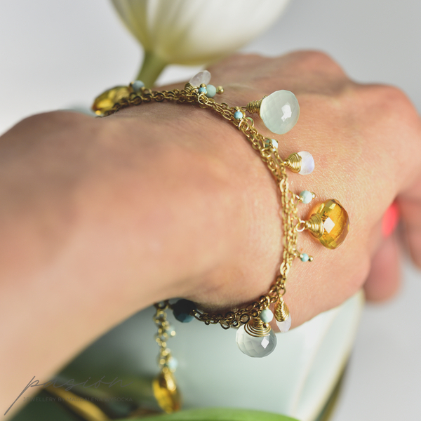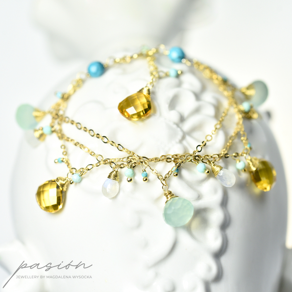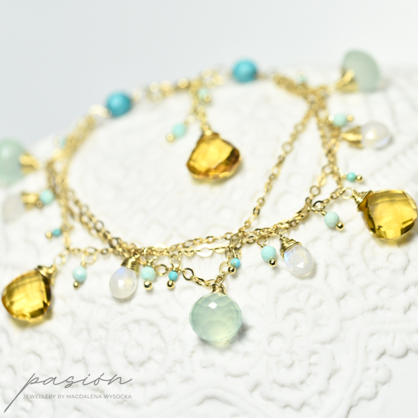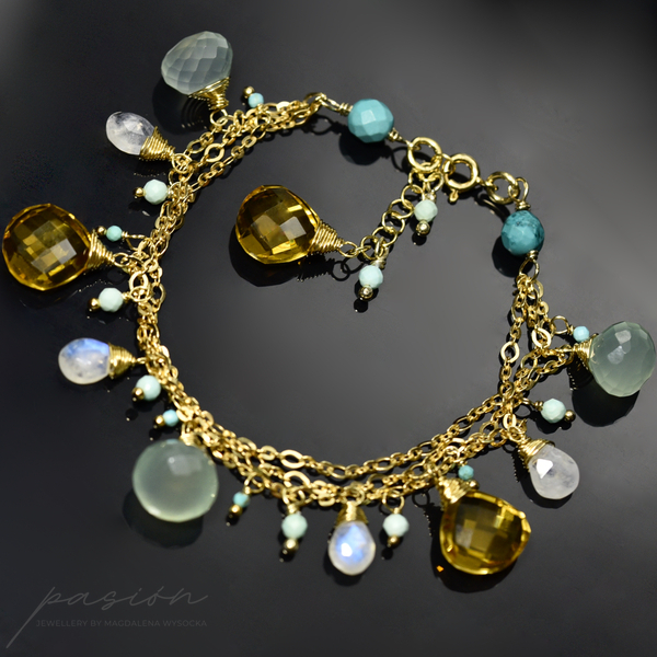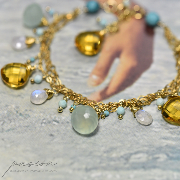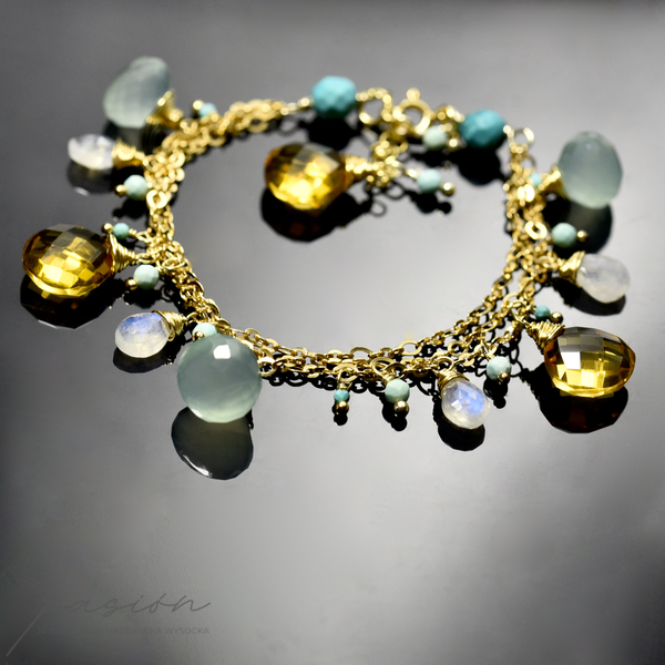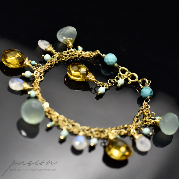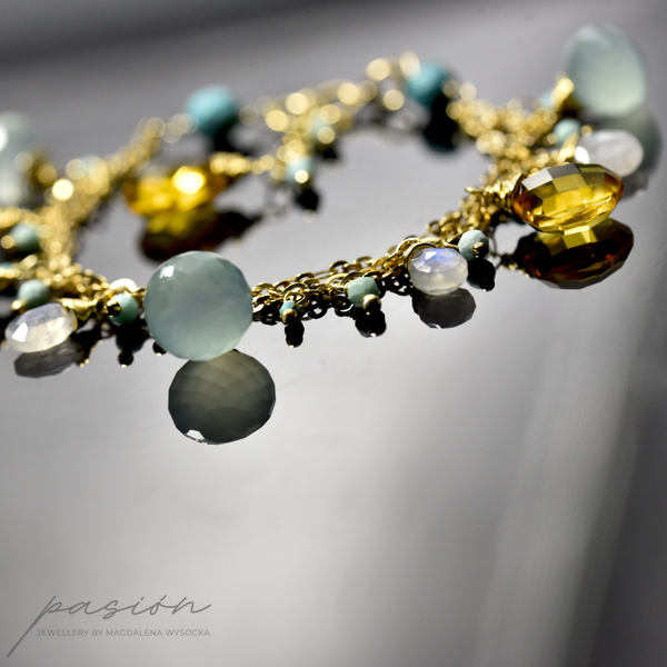 Bransoletka została wykonana ręcznie z trzech srebrnych łańcuszków złoconych 24ct złotem, na których zawisły fasetowane Chalcedony o morskiej barwie, brioletki Kamieni księżycowych  niebieskiej luminescencji, fasetowane Turkusy i kule miętowych Opali peruwiańskich oraz brioletki słonecznego Cytrynu.