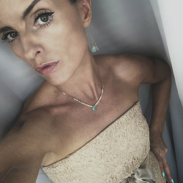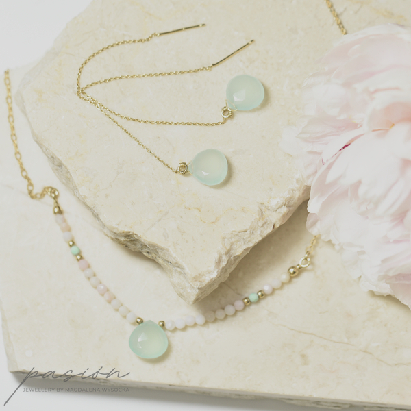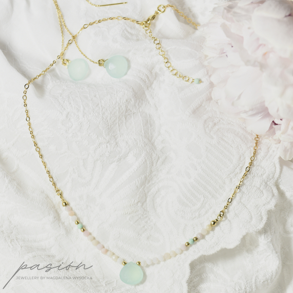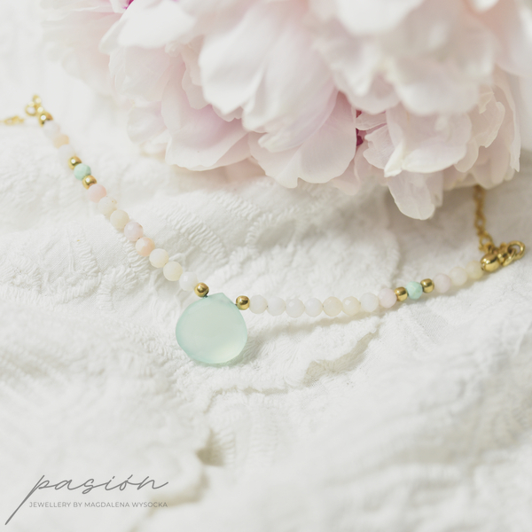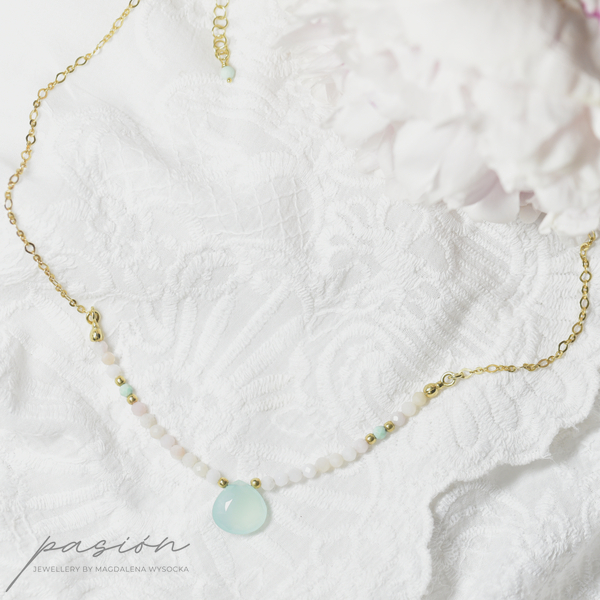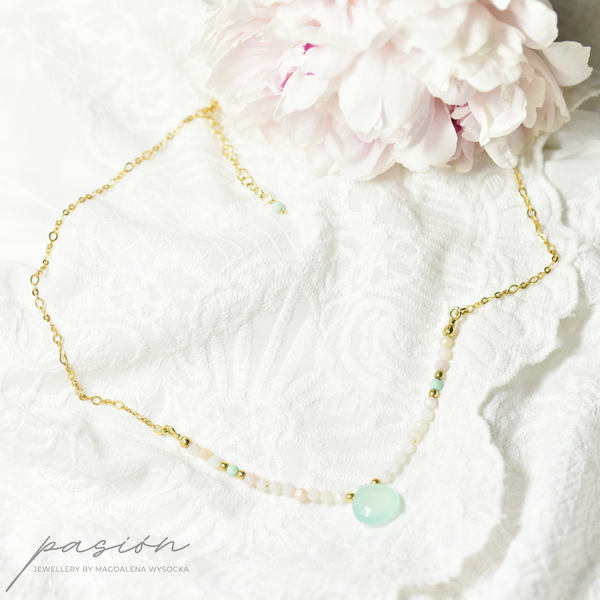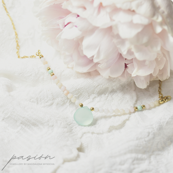 Uroczy, lekki w formie naszyjnik wykonany ręcznie z mikrofasetowanych kul różowych i miętowych Opali peruwiańskich oraz fasetowanej brioletki Chalcedonu o niesamowitym, morskim odcieniu. Elementy złote wykone zostały ze złoconego, 24ct złotem, srebra pierwszej próby 925.