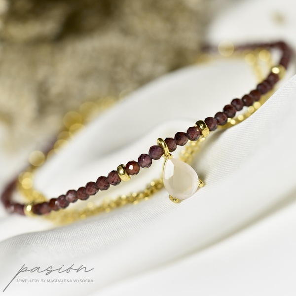 Bransoletka została wykonana ze sznura mikrofasetowanych kul Granatów w odcieniu głębokiego burgundu oraz uroczego różowego Kwarcu w ksztłacie fasetowanej kropli, otoczonego złotą oprawą. Kamienie otulone są dwoma złotymi łańcuszkami podkreślajacymi ich niezwykły blask.
