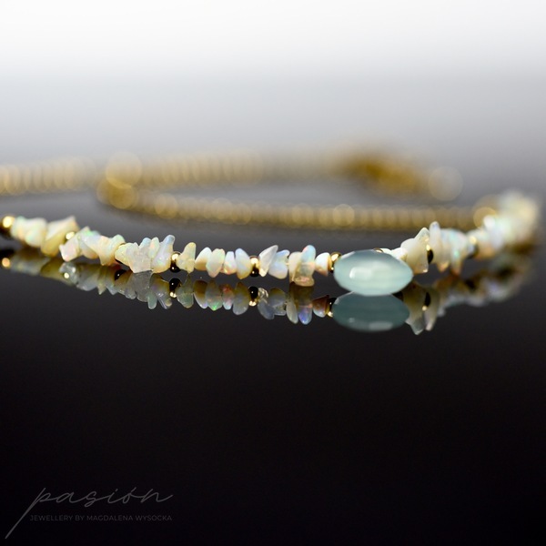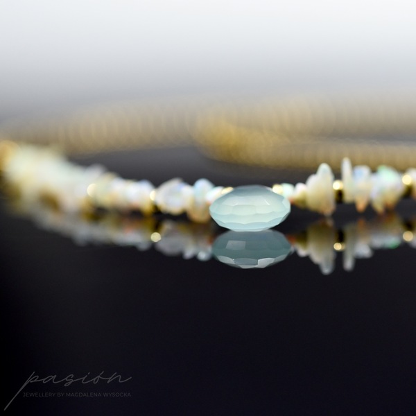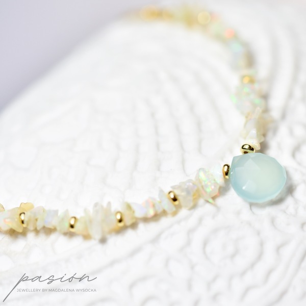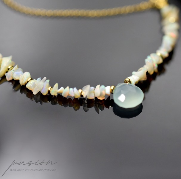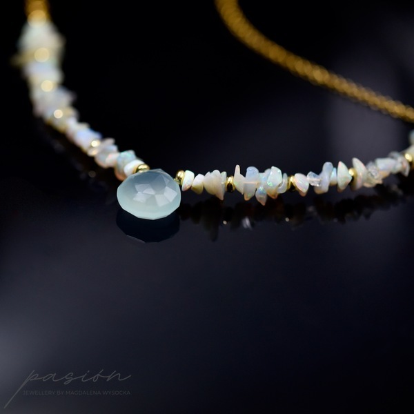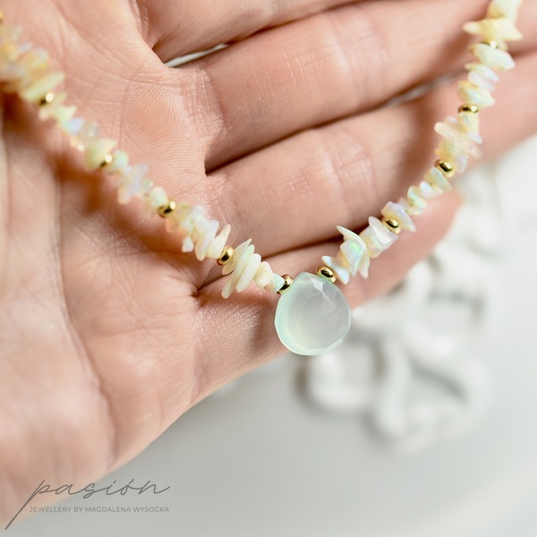 Delikatny naszyjnik wykonany ręcznie, przepełniony surowymi kawałkami nieoszlifowanych naturalnych Opali etiopskich o zielonej, niebieskiej i różowej opalizacjii, zmieniającymi barwę w zależności od światła. W centrum naszyjnika zawisła miętowa brioletka Chalcedonu.