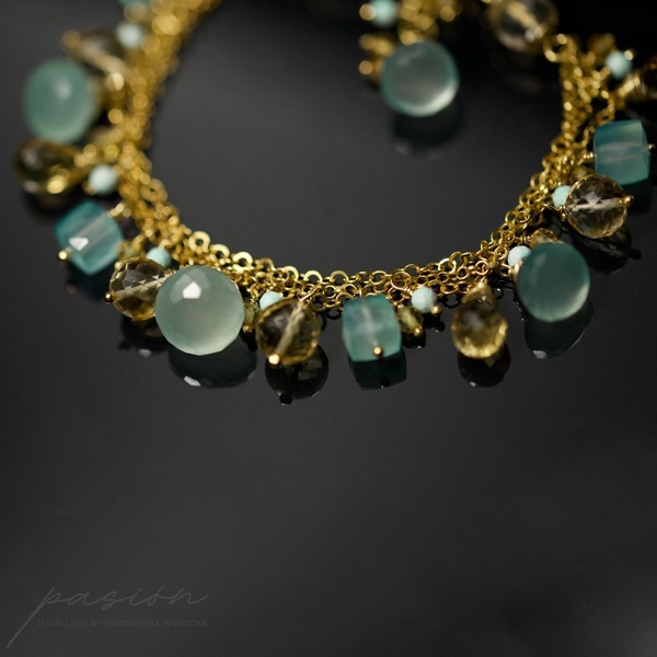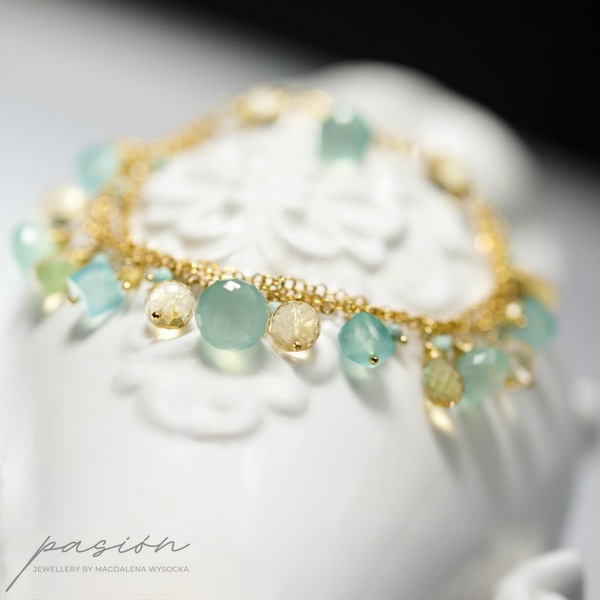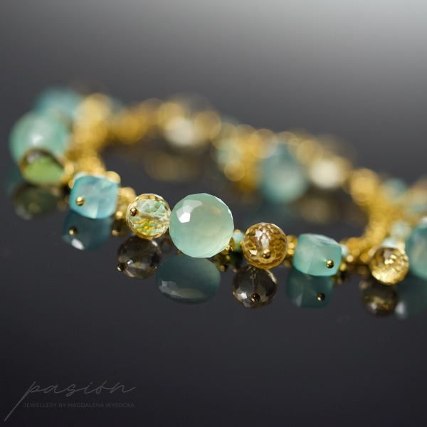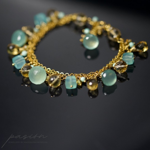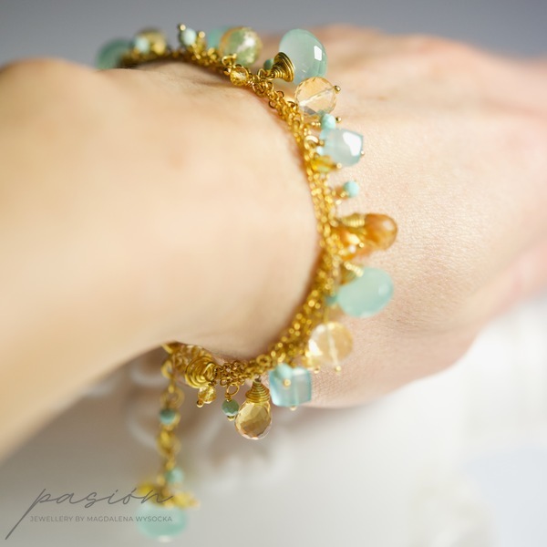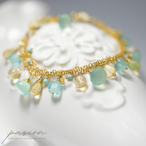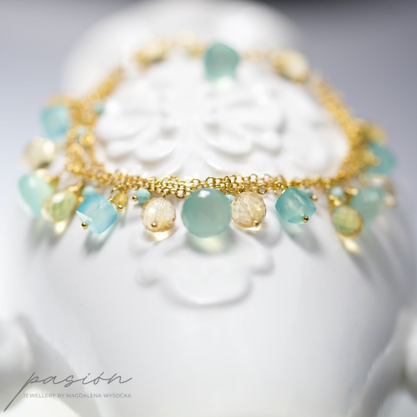 Bransoletka została wykonana ręcznie z trzech srebrnych łańcuszków złoconych 24ct złotem, na których zawisły fasetowane Chalcedony aqua o morskiej barwie w kształcie cebulek oraz kostek, kule miętowych Opali peruwiańskich oraz brioletki i kule słonecznego Cytrynu.