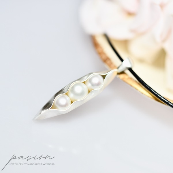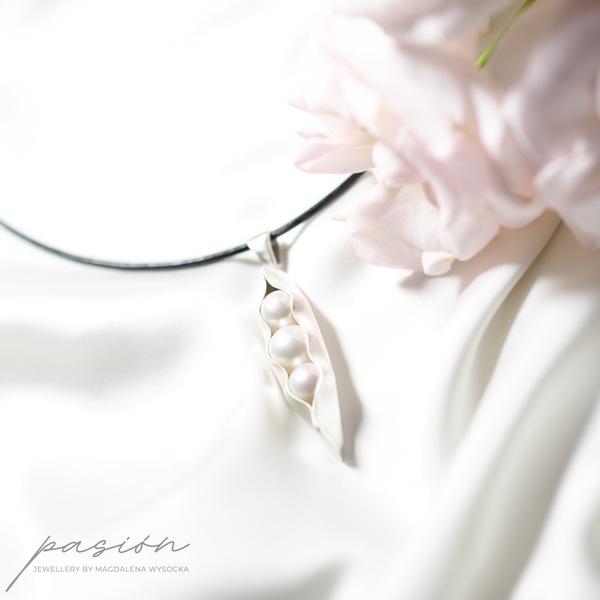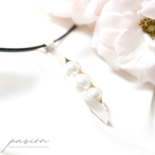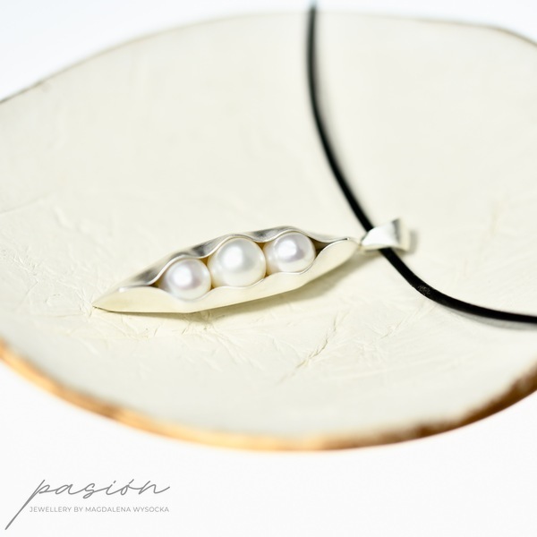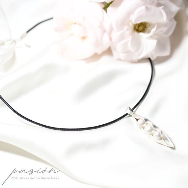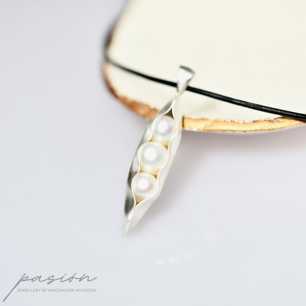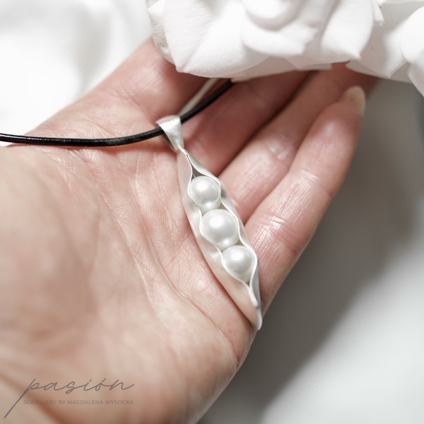 W ukształtowanym ręcznie strączku groszku umieszczone zostały piękne, najwyższej jakości trzy białe Perły, a całość zawieszona na skórzanym czarnym rzemieniu.