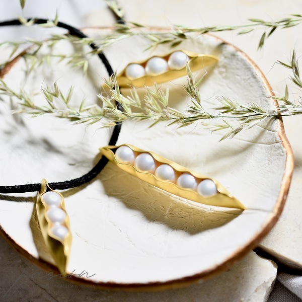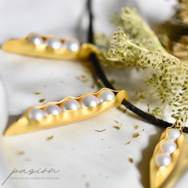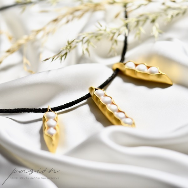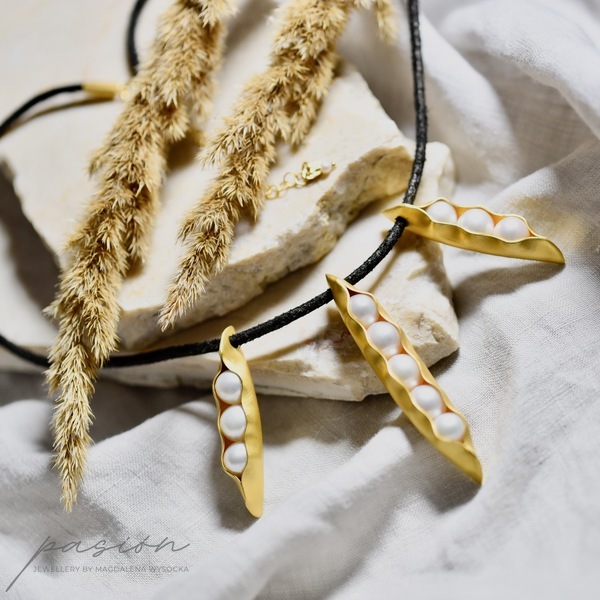 W ukształtowanych ręcznie trzech strączkach umieszczone zostały piękne, najwyższej jakości białe Perły, a całość zawieszona na skórzanym surowym, ciemnobrązowym rzemieniu. Naszyjnik tworzy niebanalną, kontrastową ozdobę kobiecego dekoltu.