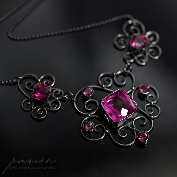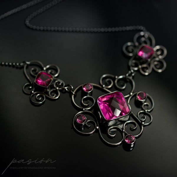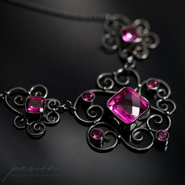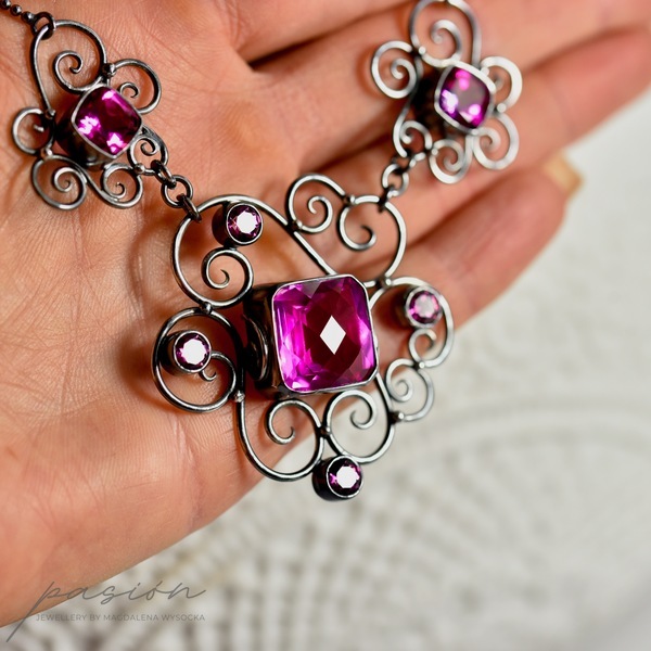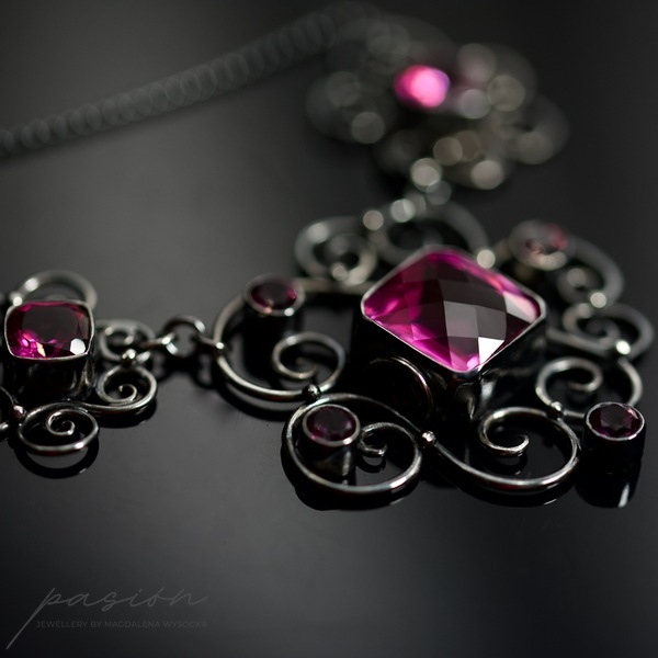 Emanujący kobiecością, efektowny naszyjnik, ozdobiony najwyższej jakości ciemnoróżowymi Topazami w oryginalnym kształcie typu "cushion", klasycznymi Topazami o szlifie diamentowym oraz srebrnymi zdobieniami nawiazującymi do pnączy dzikich róż.