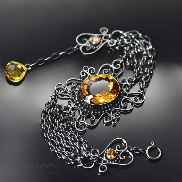 Centralny Cytryn oprawiony został w srebrną cargę, otoczony rzędami kuleczek podkreślających blask kamienia oraz ozdobiony wiktoriańskimi ornamentami. Obwód bransolety tworzą solidne, srebrne łańcuchy zakończone stylizowanymi ornamentami z fasetowanymi ciemnozłocistymi okrągłymi Cytrynami przy zapięciu.