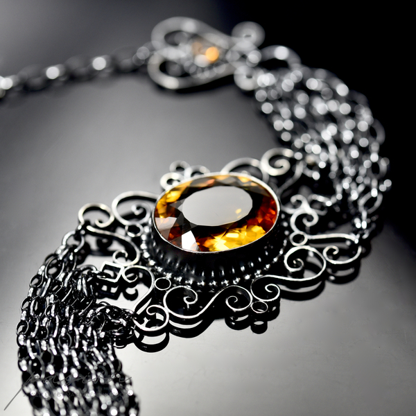 Okazała, srebrna bransoleta w stylu wiktoriańskim wykonana ręcznie z oksydowanego na czarno srebra próby 925, ozdobiona najwyższej jakości fasetowanym, ciemnozłocistym Cytrynem w kształcie owalu oraz brioletką Cytrynu w kształcie odwróconego serca.