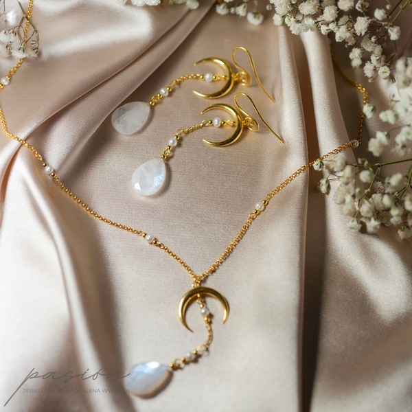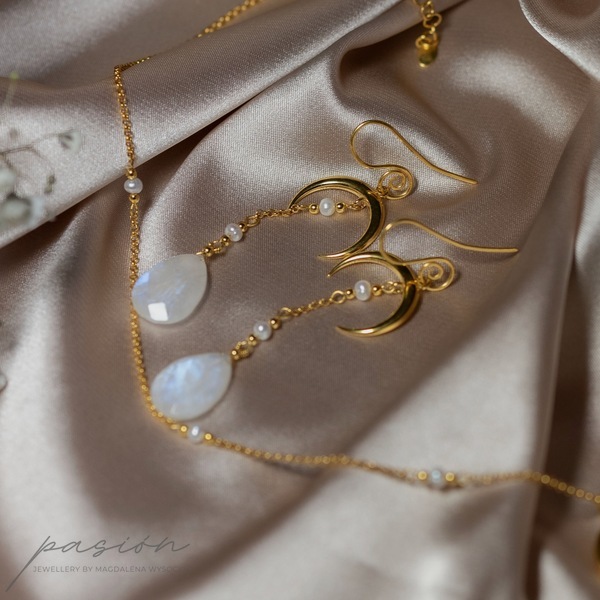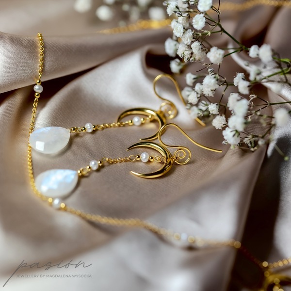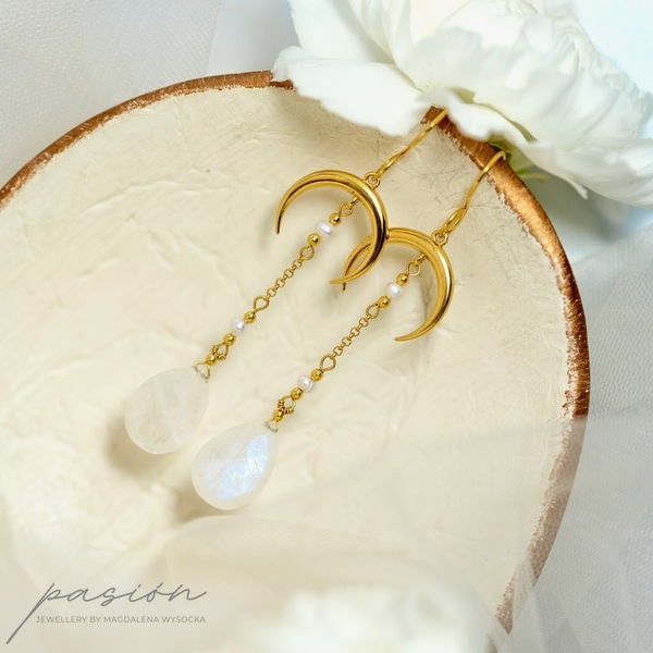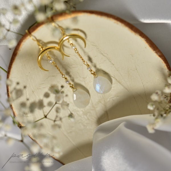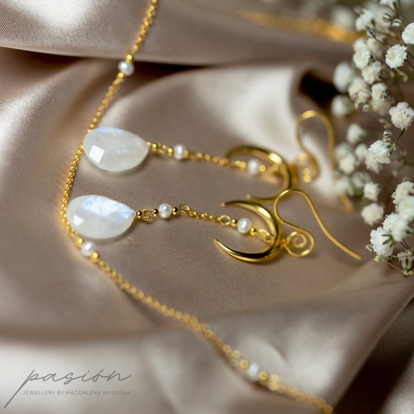 Na ozdobnym biglu ze spiralką zawieszone zostały złote półksiężyce , naturalne Perełki oraz fasetowane brioletki Kamieni Księżycowych o niebieskiej adularyzacji (niebieska poświata, która pojawia się w zależności od kąta padania światła). Całość tworzy lekką, oryginalną formę.
