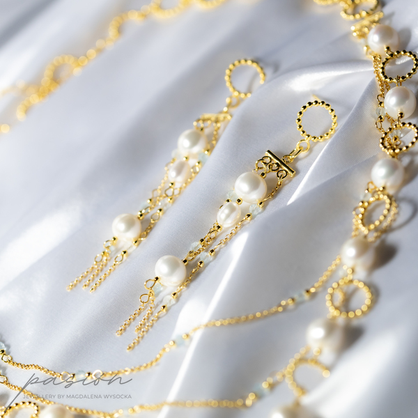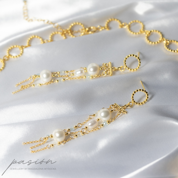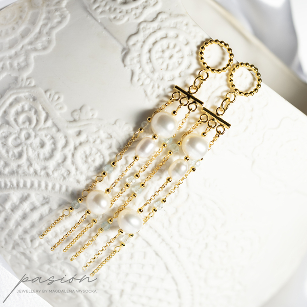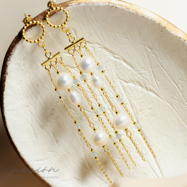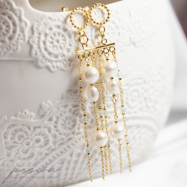 Kolczyki zostały ozdobione łańcuszkami pełnymi naturalnych Pereł w ksztacie kul i ryżu oraz fasetowanymi kulami Akwamarynów w odcieniu jasnoniebieskim.