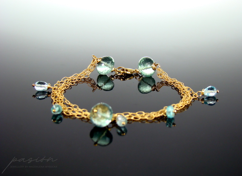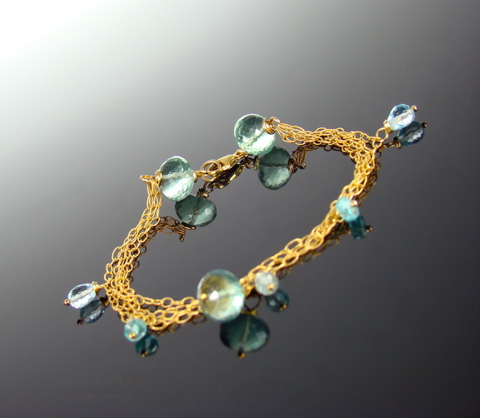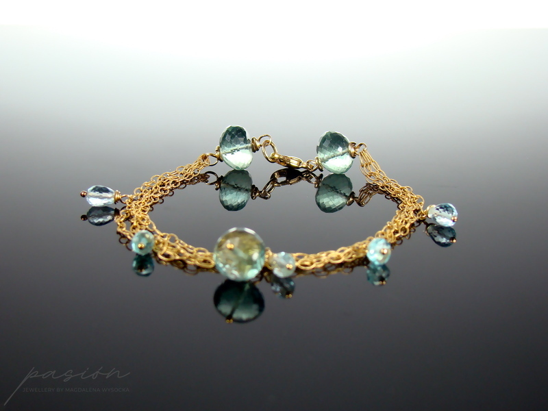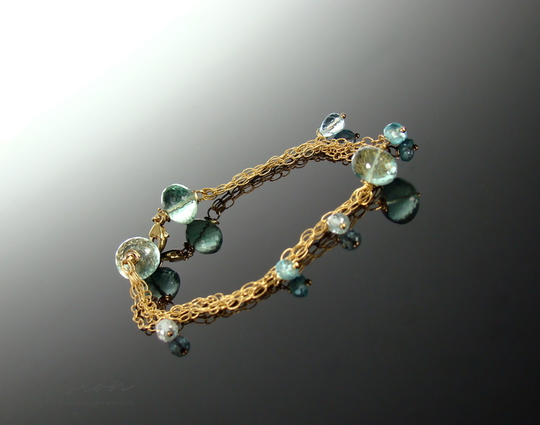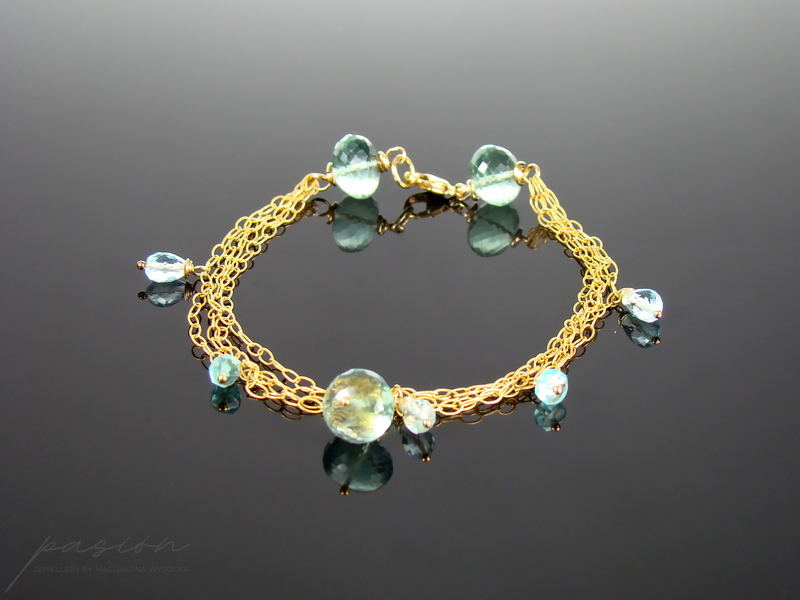 Pachnąca tropikalnymi wyspami bransoletka z kamieniami szlchetnymi w odcieniach turkusowych lagun, wykonana ręcznie z czterech łańcuszków ze stopu 14ct Gold Filled.