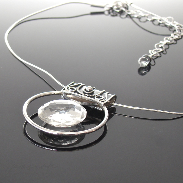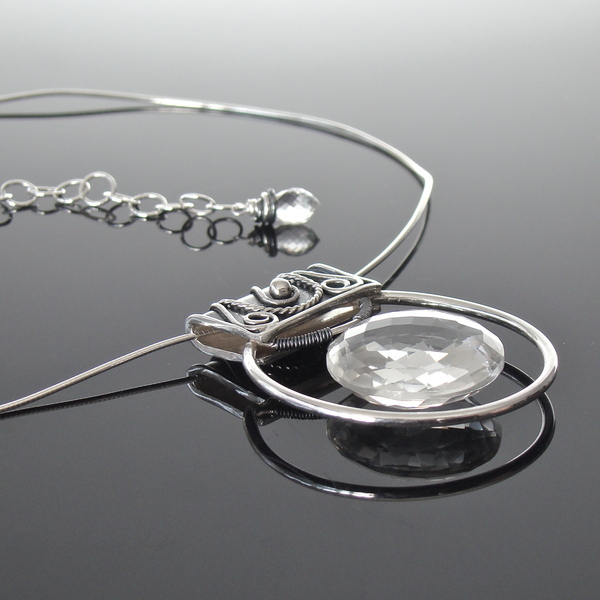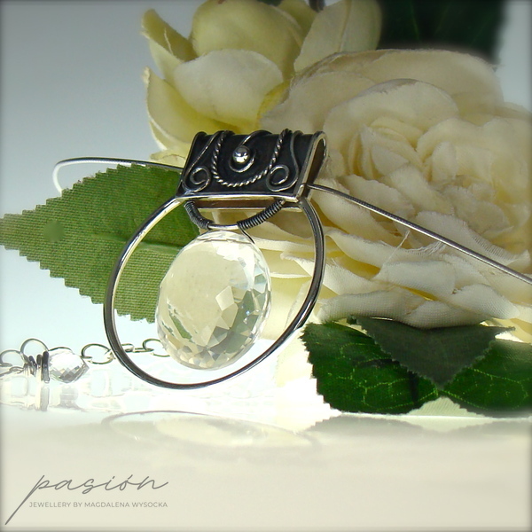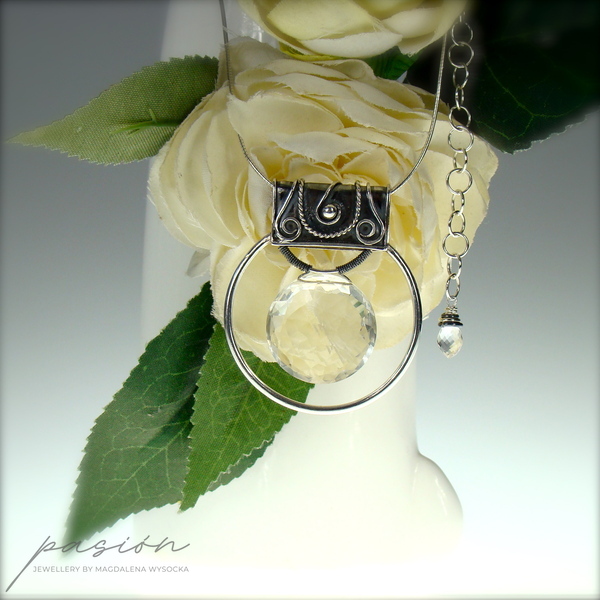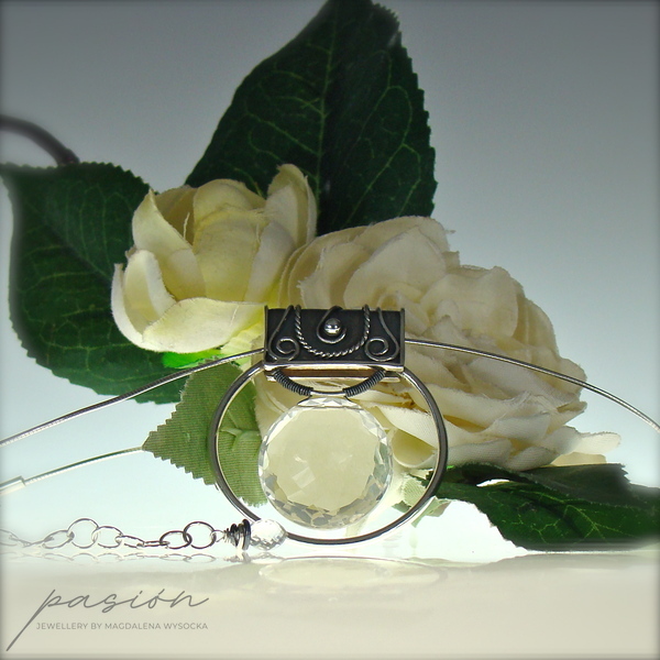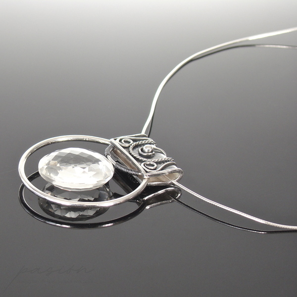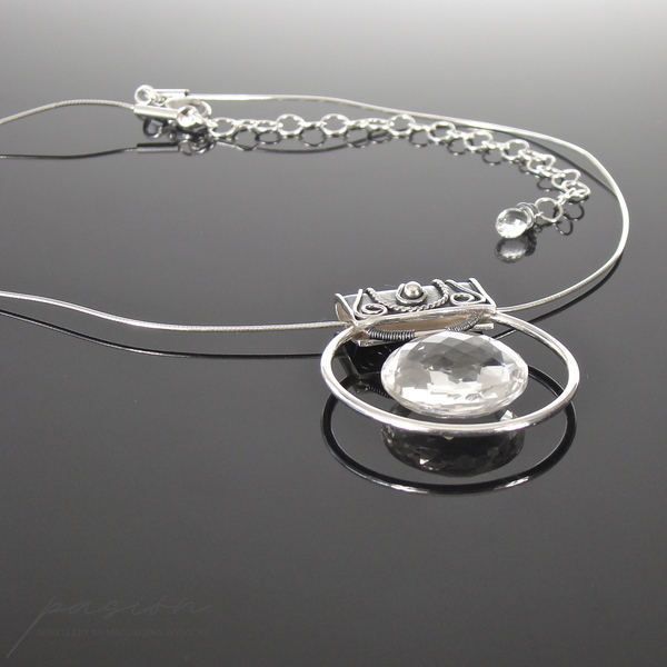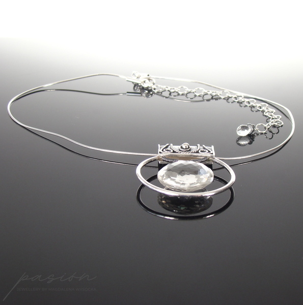 Sercem naszyjnika jest okazały, fasetowany indyjski Kryształ Górski o niesamowitym połysku i średnicy 22 mm, zawieszony na wytwornie zdobionej, oksydowanej kasetce. Dyskretna, ale równocześnie luksusowa zawieszka umieszczona została na srebrnej „żmijce” zakończonej łańcuszkiem przedłużającym naszyjnik o 10 cm. Na jego końcu subtelnie prezentuje się fasetowana brioleta najczystszego Górskiego Kryształu w kształcie markizy.