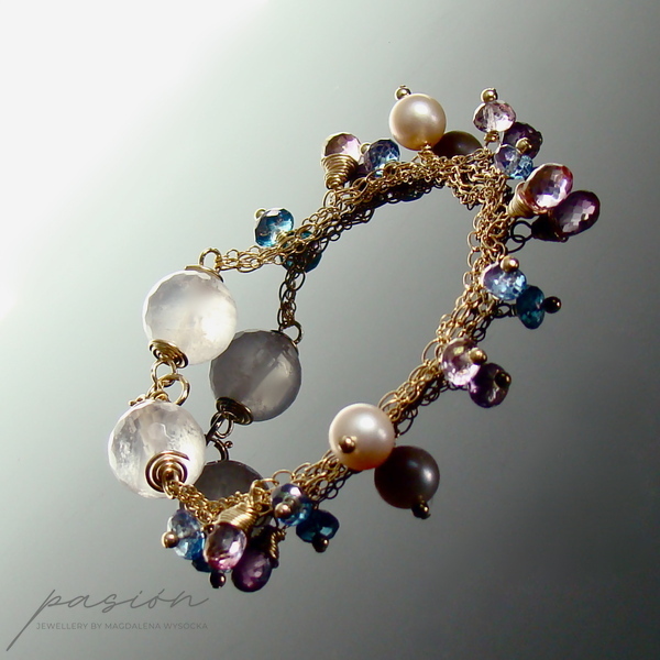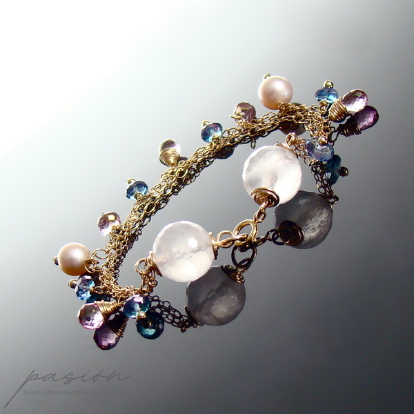Subtelna, romantyczna, letnia bransoletka z kolekcji SUMMER DELIGHT z kamieniami naturalnymi w odcieniach różu i błękitu, wykonana ręcznie z trzech łańcuszków ze stopu 14ct Gold Filled.