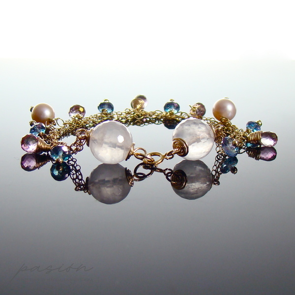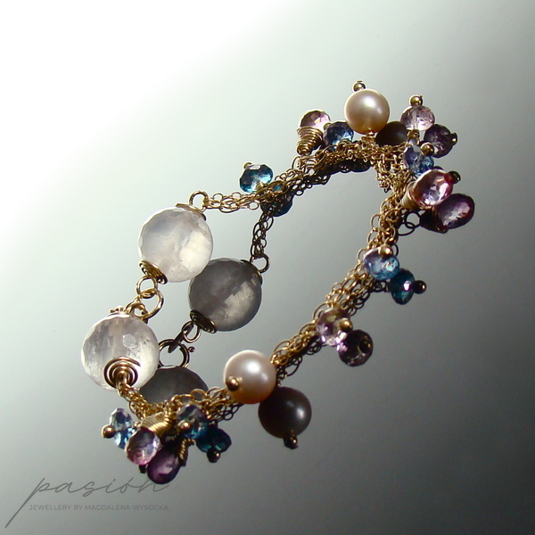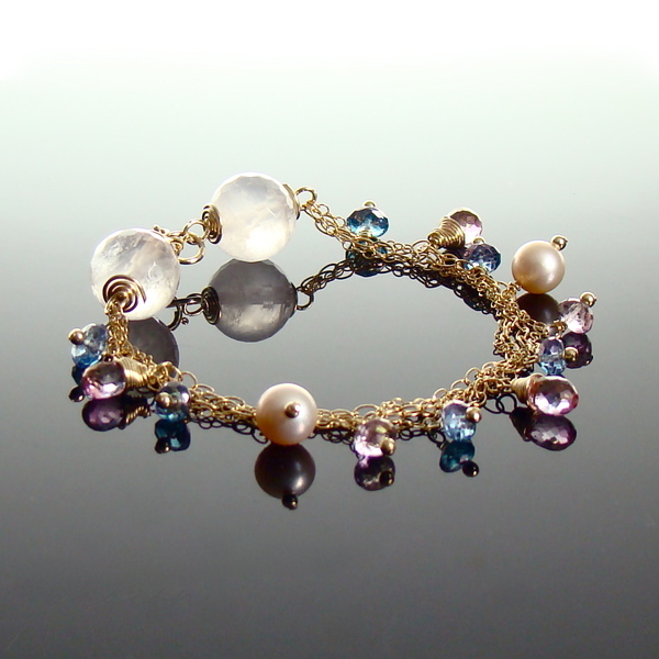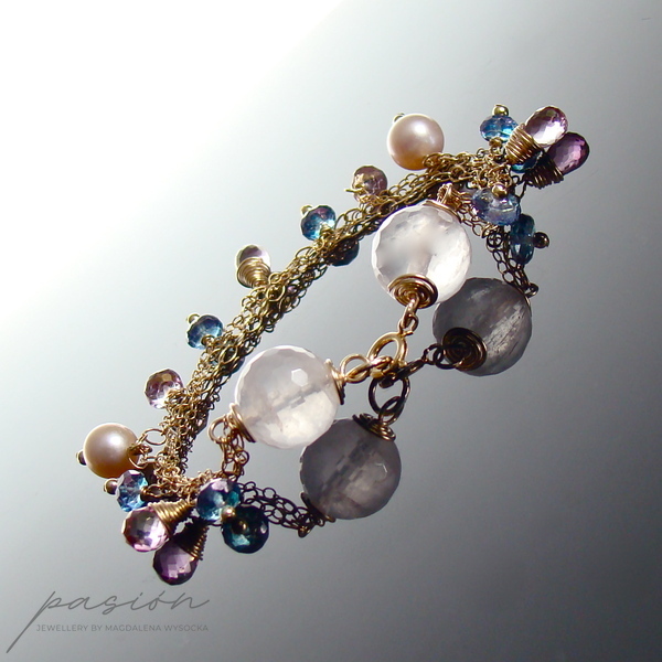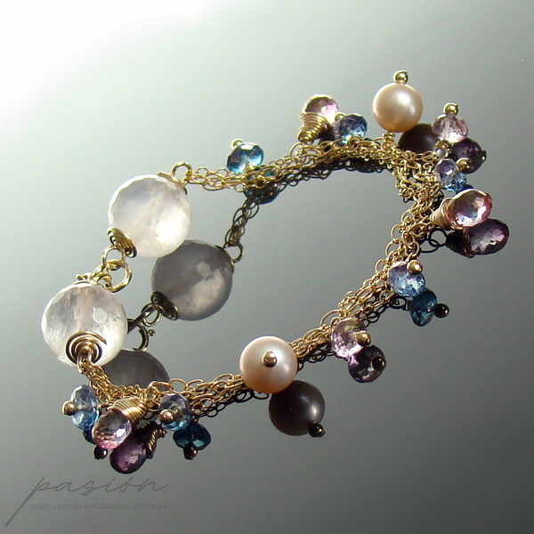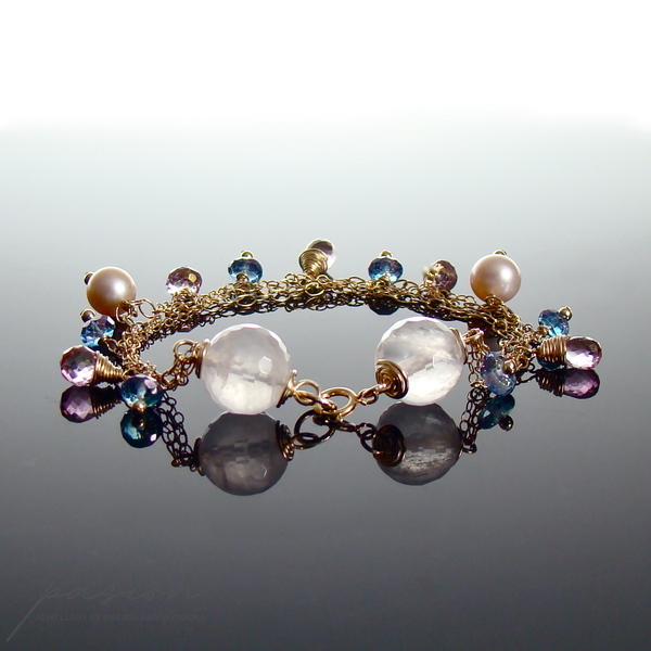 Złota bransoletka została ozdobiona fasetowanymi kulami Kwarcu Różowego, naturalnie różowymi Perłami słodkowodnymi, fasetowanymi brioletkami Różowych Topazów i oponkami Niebieskich Topazów.
