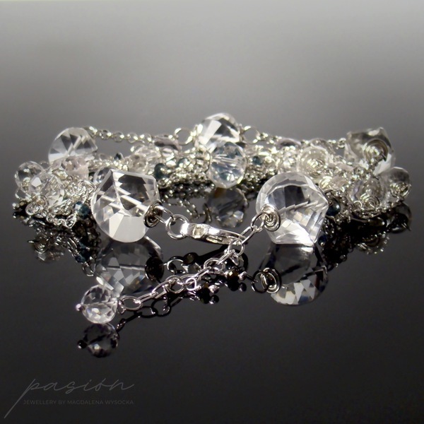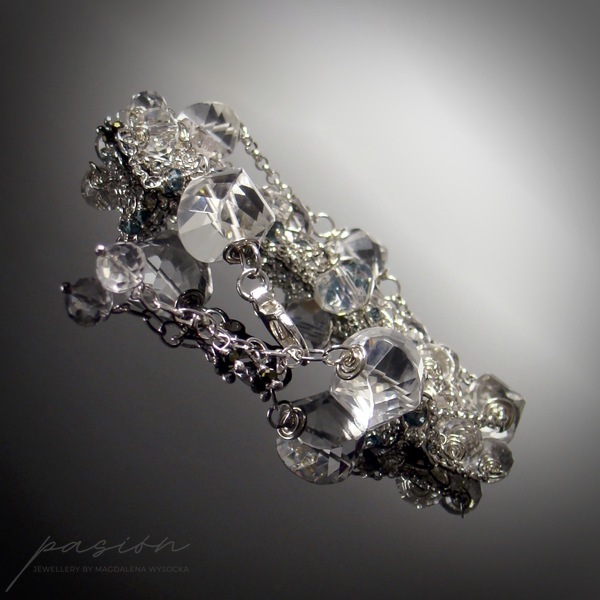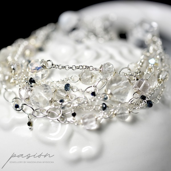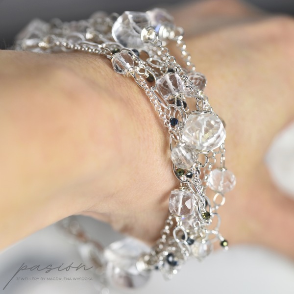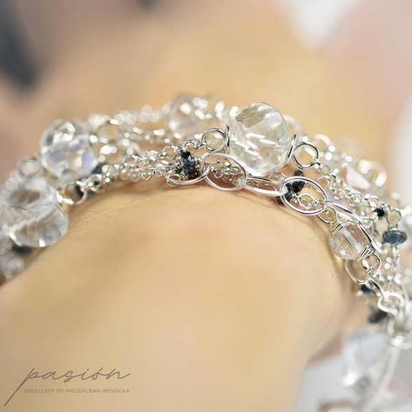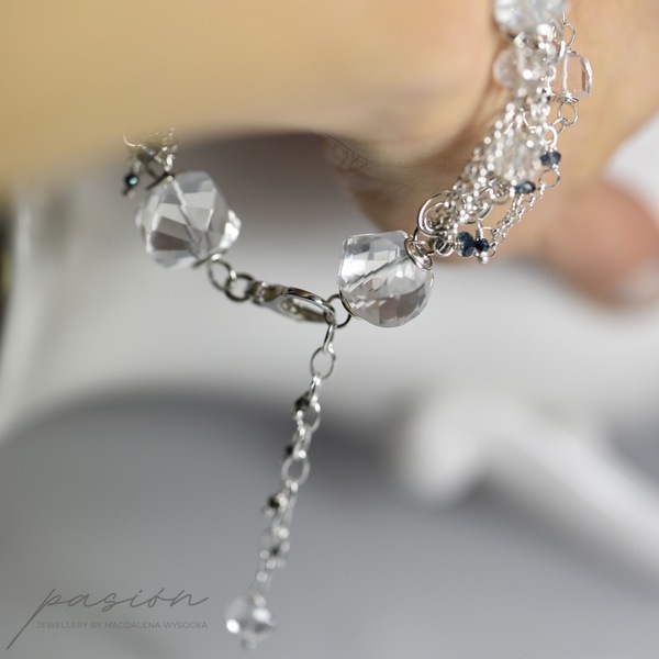 Bransoleta została ozdobiona wieloma srebrnymi łańcuszami, na których umocowane zostały fasetowane kamienie: Kryształy górskie, platerowane Kwarce, Topazy London Blue, platerowane Spinele, Ametysty lawendowe. Całość tworzy kryształową ozdobę nadgarstka przełamaną kolorem granowym (london blue).