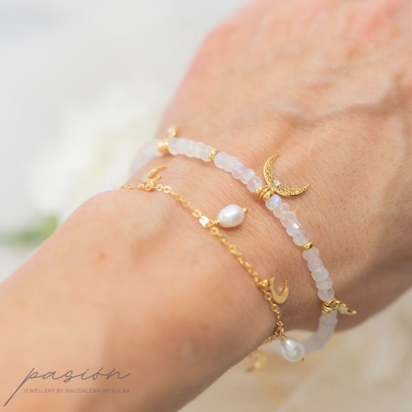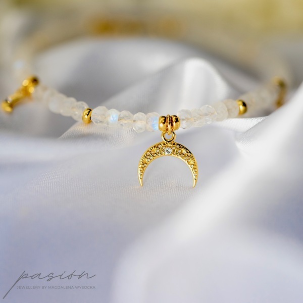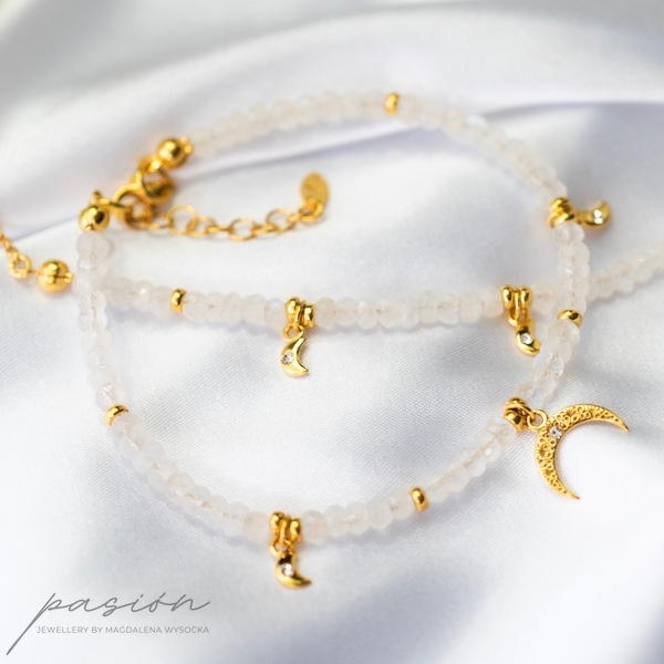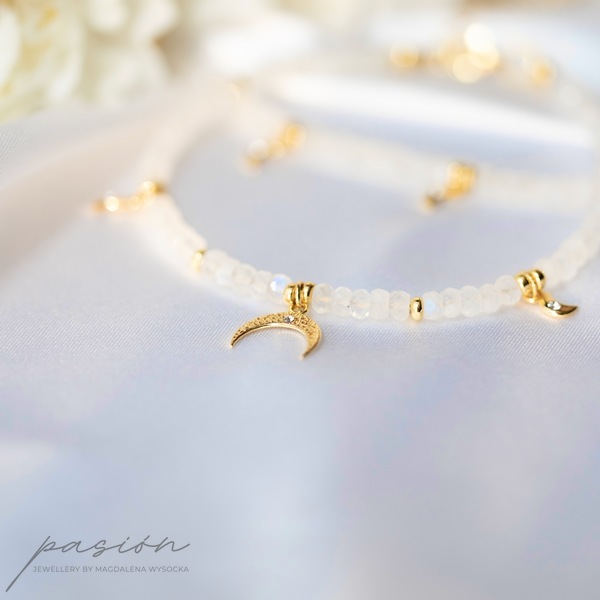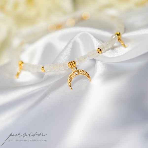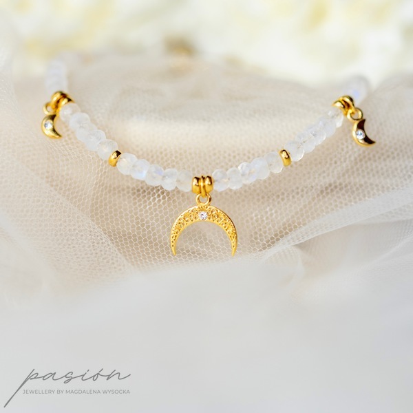 Centrum bransoletki stanowi złoty półksiężyc z kryształkiem Preciosa ozdobiony ażurowym wzorem w otoczeniu sznura mikrofasetowanych oponek Kamieni Księżycowych oraz malutkich półksiężyców z kryształkiem Preciosa.