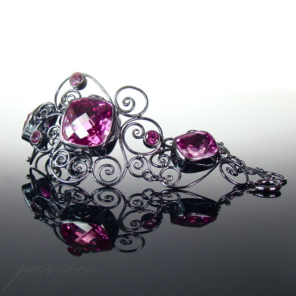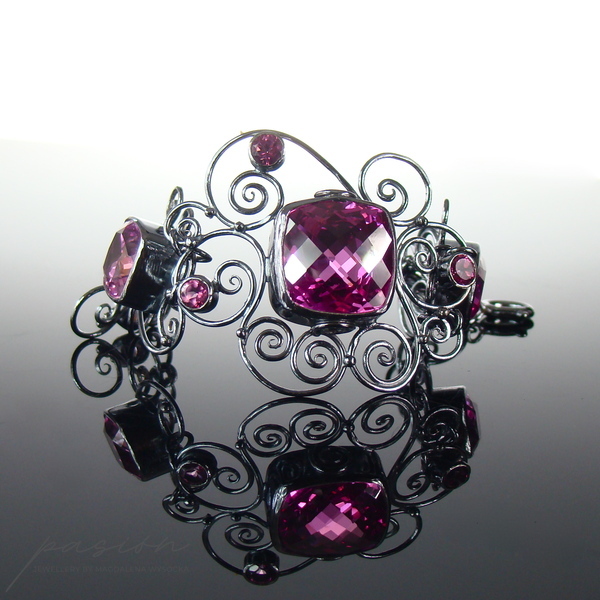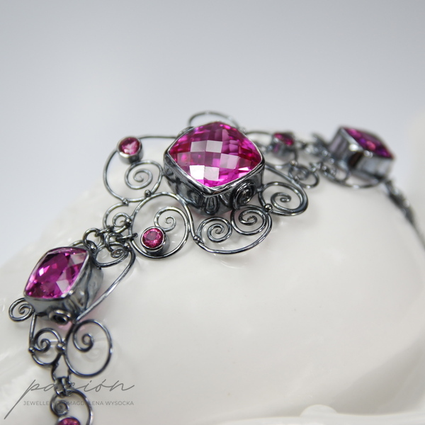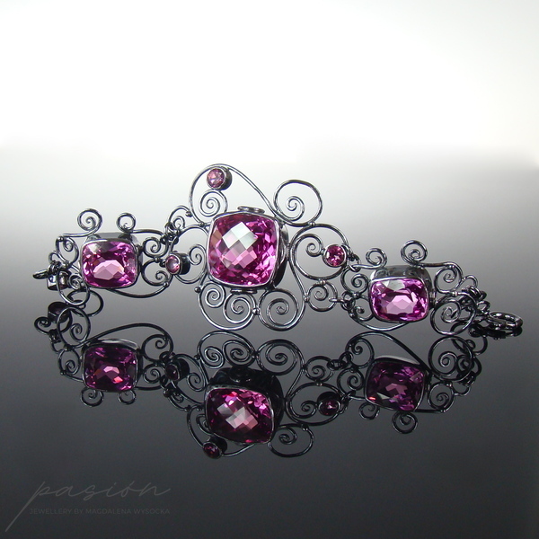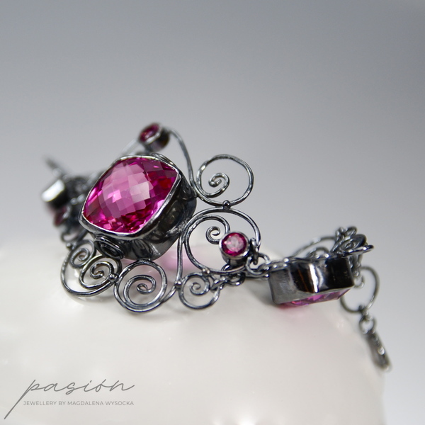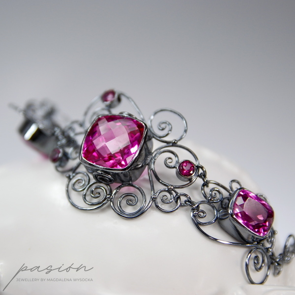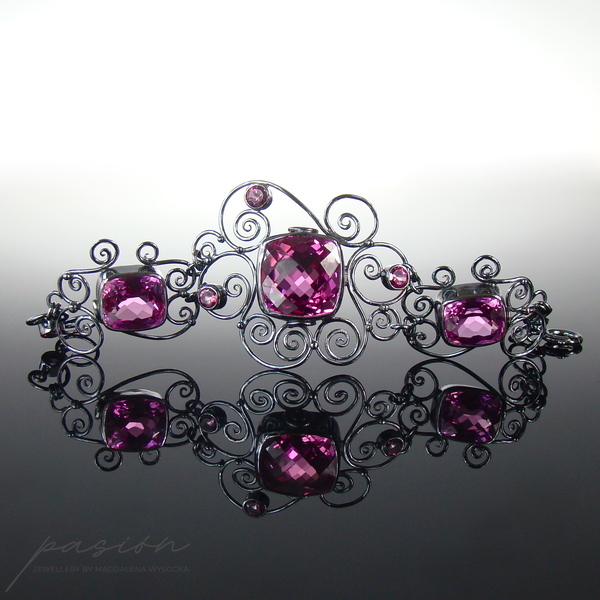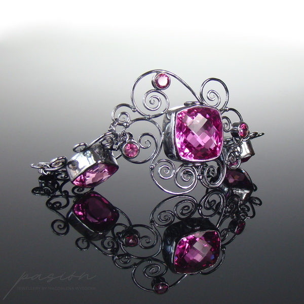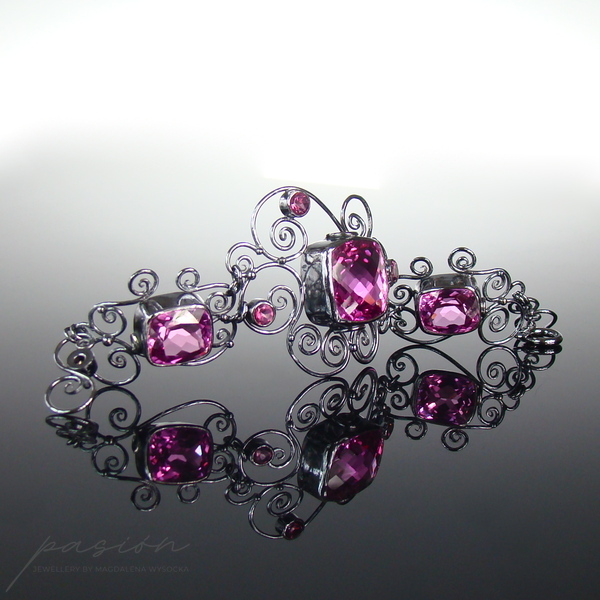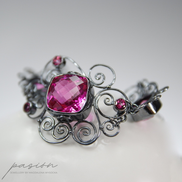 Niezwykle kobieca, efektowna bransoleta ozdobiona najwyższej jakości ciemnoróżowymi, ogromnymi Topazami w oryginalnym kształcie typu "cushion", klasycznymi Topazami o szlifie diamentowym oraz srebrnymi zdobieniami nawiazującymi do pnączy dzikich róż.