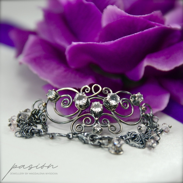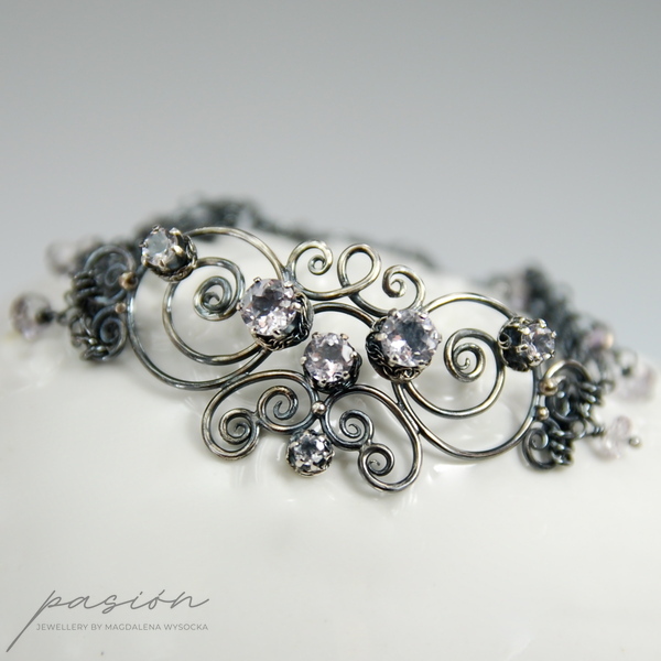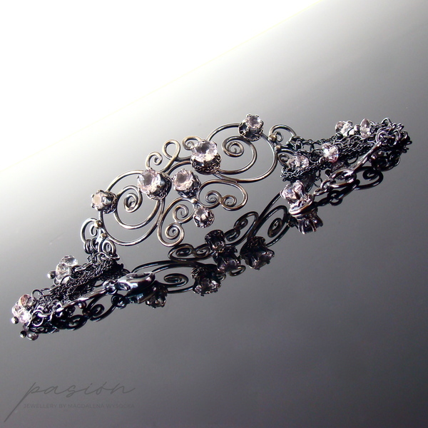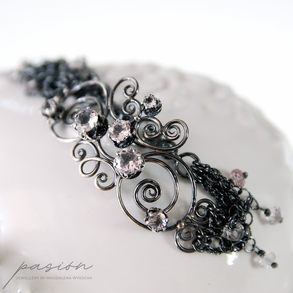 Niezwykle kobieca bransoleta wykonana ręcznie ze srebra pierwszej próby 925 i 999, ozdobiona wieloma drogocennymi, najwyższej jakości jasnoróżowymi Morganitami o niecodziennym, diamentowym szlifie i blasku. Na kilku łańcuszkach zawisły także mikrofasetowane oponki Morganitów.