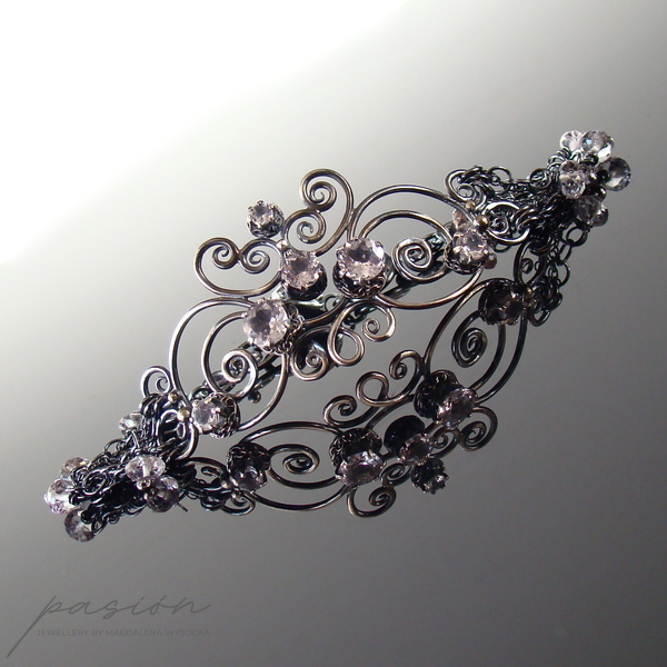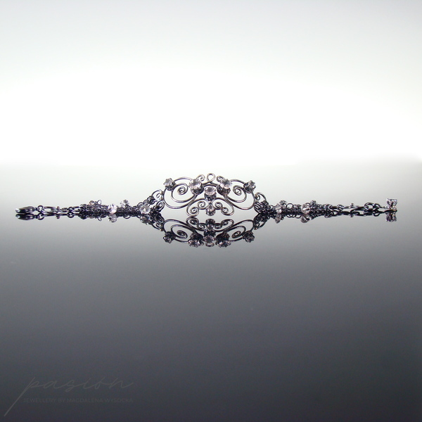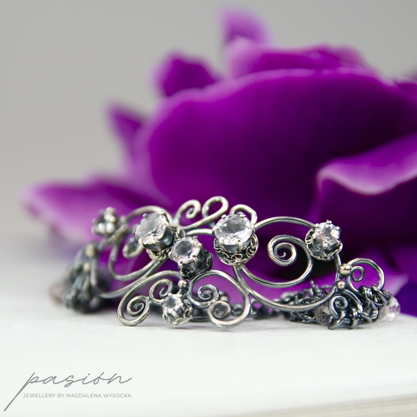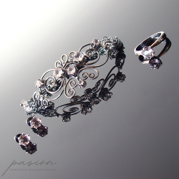 Wszystkie Morganity zostały oprawione w srebrne "łapki", a całość bransolety jest zoksydowana oraz wypolerowana na wysoki, jasny połysk.