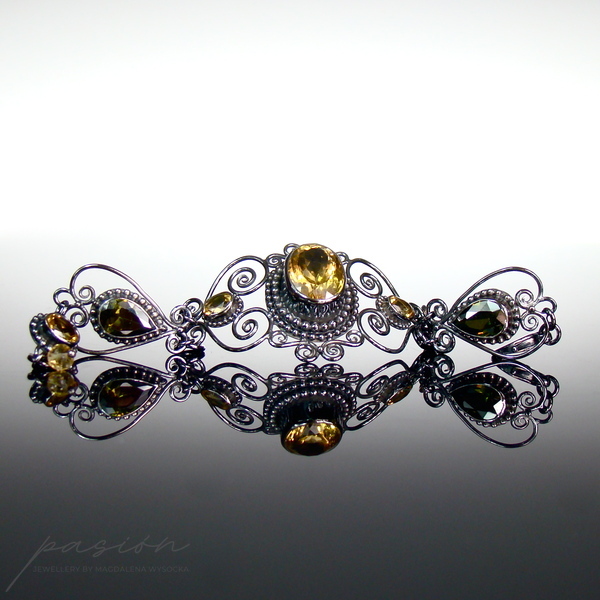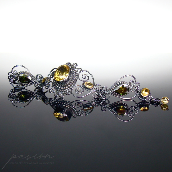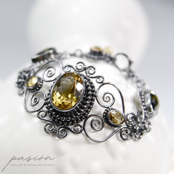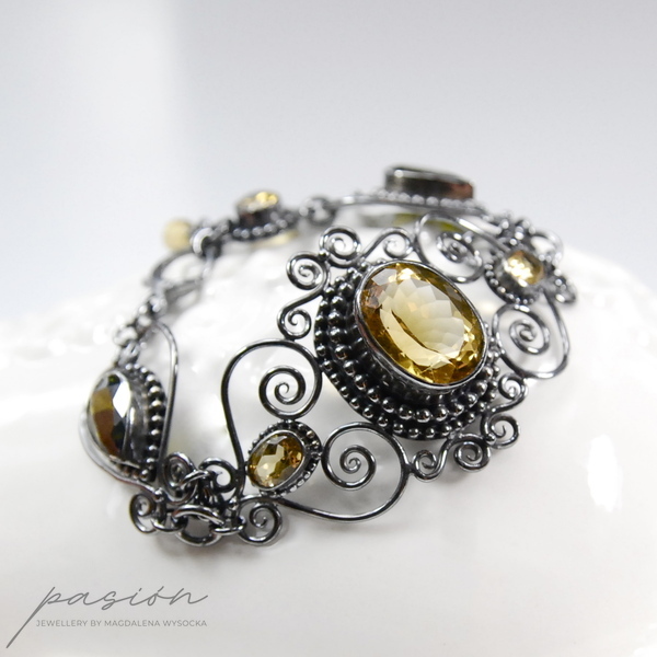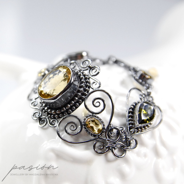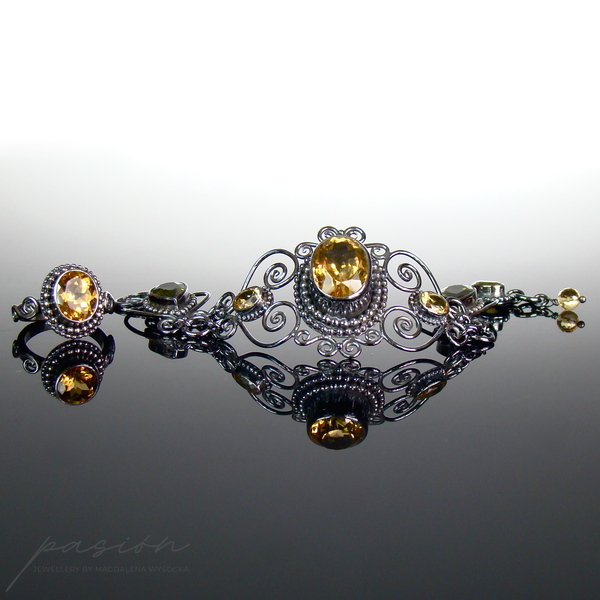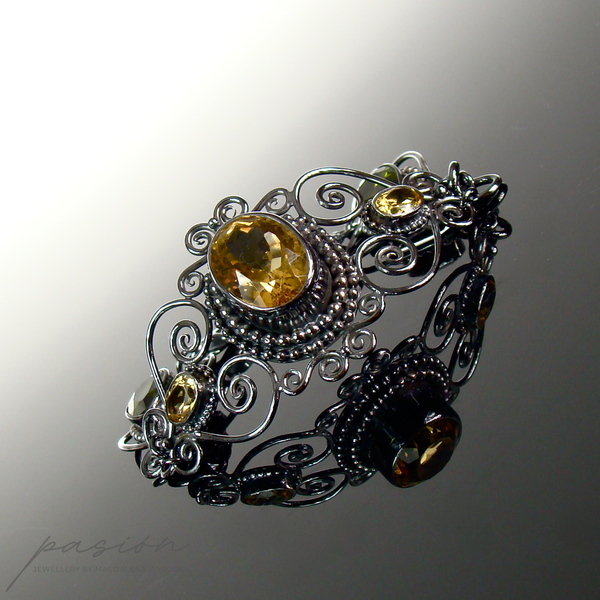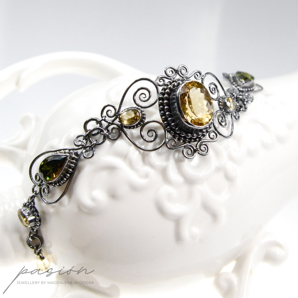 Okazała, srebrna bransoleta wykonana ręcznie z oksydowanego na czarno srebra próby 999 i 925, ozdobiona najwyższej jakości fasetowanymi, złocistymi Cytrynami w kształcie owali oraz Kwarcami Turmalinowym o kształcie kropli.