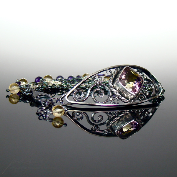 Niezwykle kobieca bransoleta ozdobiona najwyższej jakości dwukolorowym Ametrynem w oryginalnym kształcie typu "cushion" oraz microfasetowanymi oponkami fioletowych Ametystów i kulami żółtych Cytrynów zawieszonych na wielu łańcuszkach.