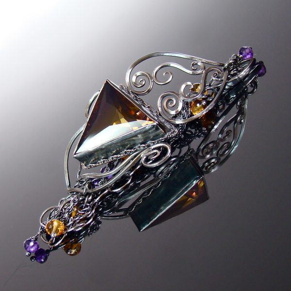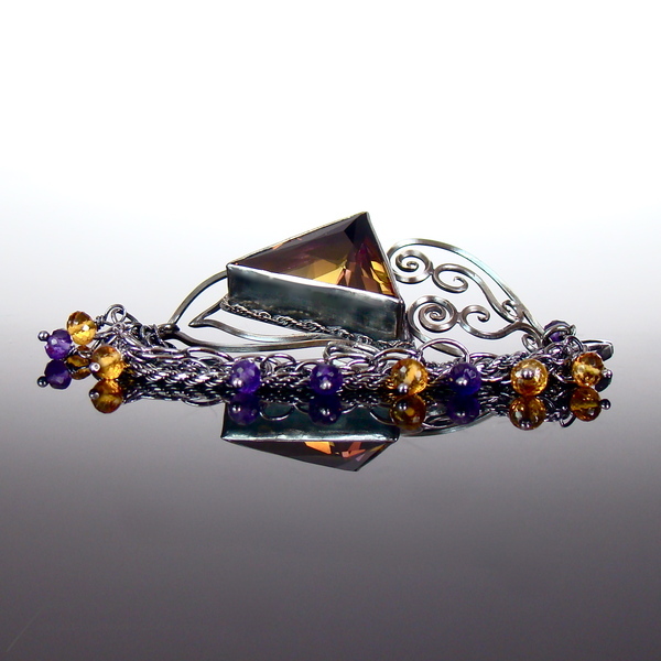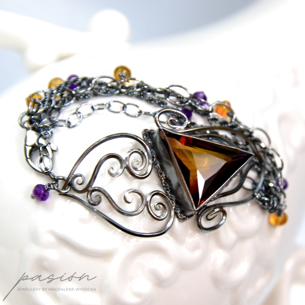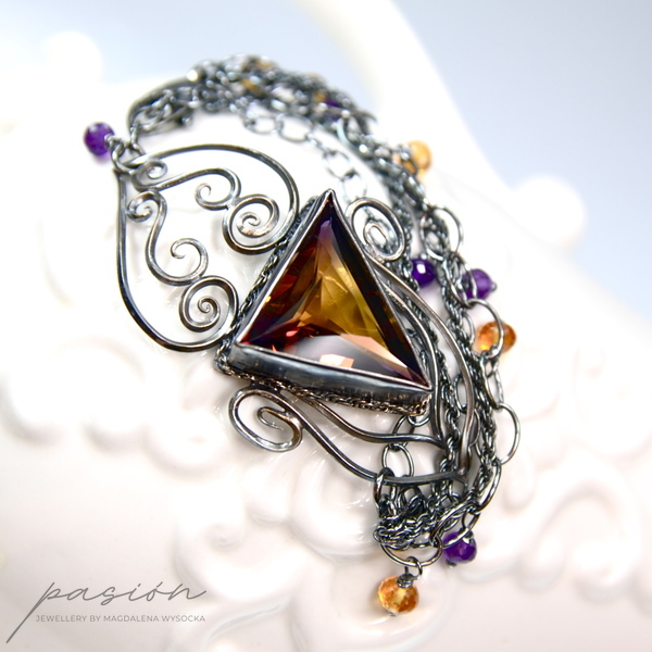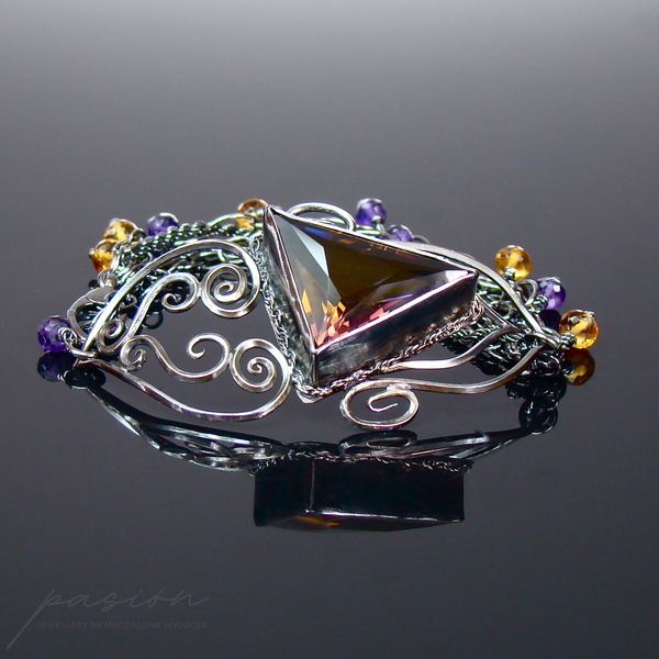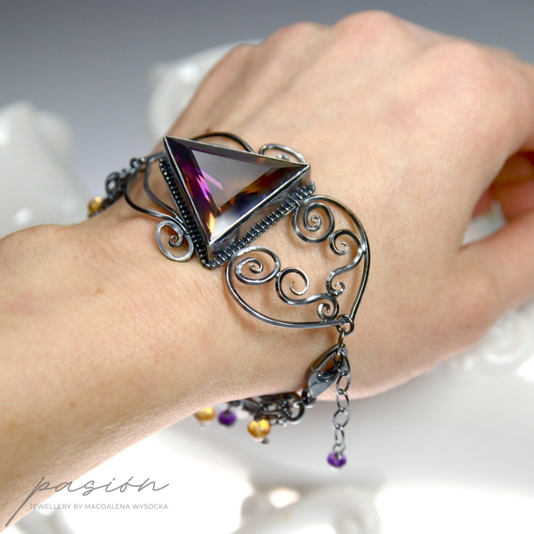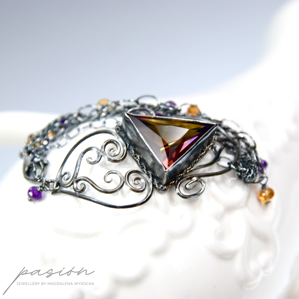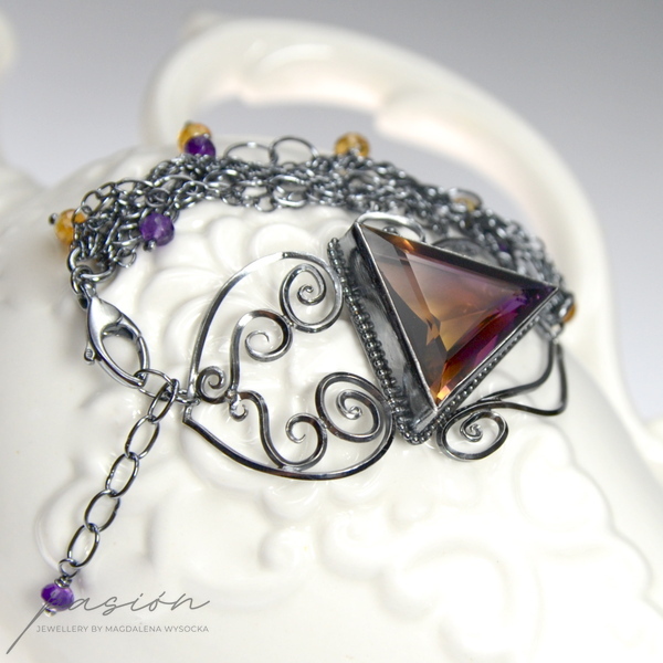 Oryginalna w formie, nieco tajemnicza i mroczna bransoleta ozdobiona najwyższej jakości dwukolorowym Ametrynem o niezwykle rzadkim i nietypowym kształcie. Ametryn to kamień szlachetny łączący Cytryn i Ametyst, stąd mieni się odcieniami fioletu, ciemnego złota i żółtego.